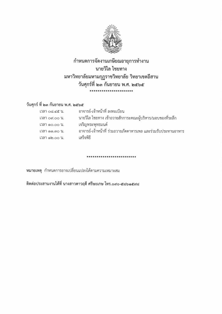 กำหนดการ งานเกษียณอายุ นายวิไล ไชยทาง 2 วัน คือ วันศุกร์ที่ 16 กันยายน 2565 ณ มหาวิทยาลัยมหามกุฏราชวิทยาลัย (ศาลายา) และ วันศุกร์ที่ 23 กันยายน 2565 ณ มหาวิทยลัยมหามกุฏราชวิทยาลัย วิทยาเขตอีสาน มมร.อส