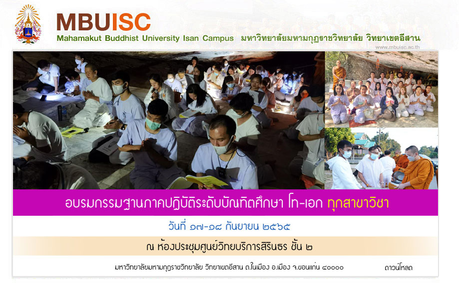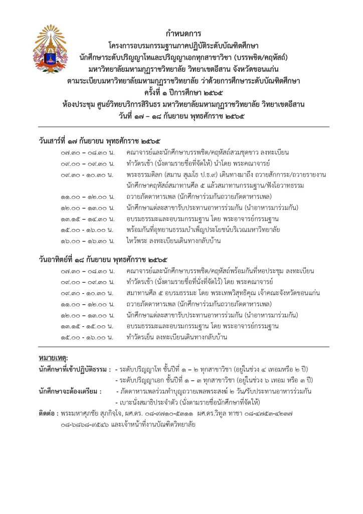กำหนดการ อบรมกรรมฐานภาคปฏิบัติระดับบัณฑิตศึกษา นักศึกษาปริญญา โท-เอก ทุกสาขาวิชา ตามระเบียบมหาวิทยาลัยมหามกุฏราชวิทยาลัย ว่าด้วยการศึกษาระดับบัณฑิตศึกษาครั้งที่ 1 ปีการศึกษา 2565 ห้องประชุม ศูนย์วิทยบริการสิรินธร มหาวิทยาลัยมหามกุฏราชวิทยาลัย วิทยาเขตอีสานวันที่ 17 – 18 กันยายน พุทธศักราช 2565