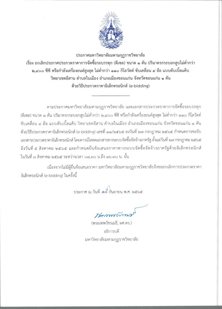 ยกเลิกประกาศ ประกวดราคาการจัดซื้อรถบรรทุก ดีเซล ขนาด 1 ตัน ปริมาตรกระบอกสูบไม่ต่ำกว่า 2400 ซีซี หรือกำลังเครื่องยนต์สงสูดไม่ต่ำกว่า 110 กิโลวัตร์ ขับเคลื่อน 4 ล้อ ตามประกาศมหาวิทยาลัยมหามกุฏราชวิทยาลัย และเอกสารการประกวดราคาการจัดซื้อรถบรรทุก ขนาด 1 ตัน ปริมาตรกระบอกสูบไม่ต่ำกว่า 2400 ซีซี