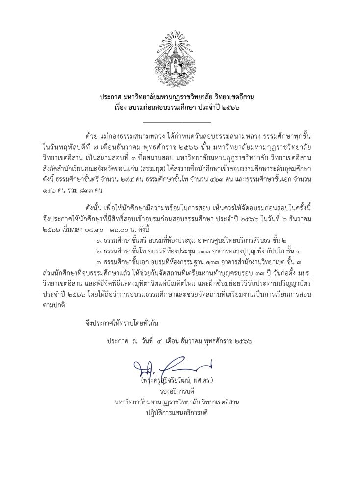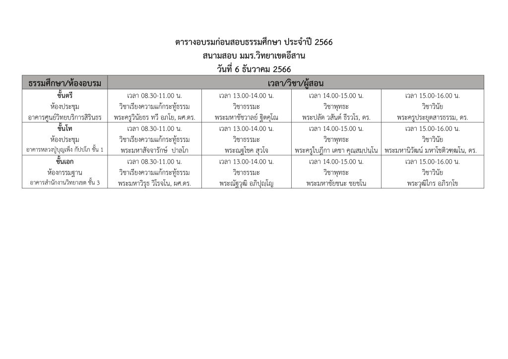 ตารางการติว (ก่อนสอบ) ในวันที่ 6 ธันวาคม 2566 ให้นักศึกษาที่กำลังสอบธรรมศึกษา ตรี โท เอก เข้าติวเข้มก่อนสอบตามตาราง ดังกล่าว