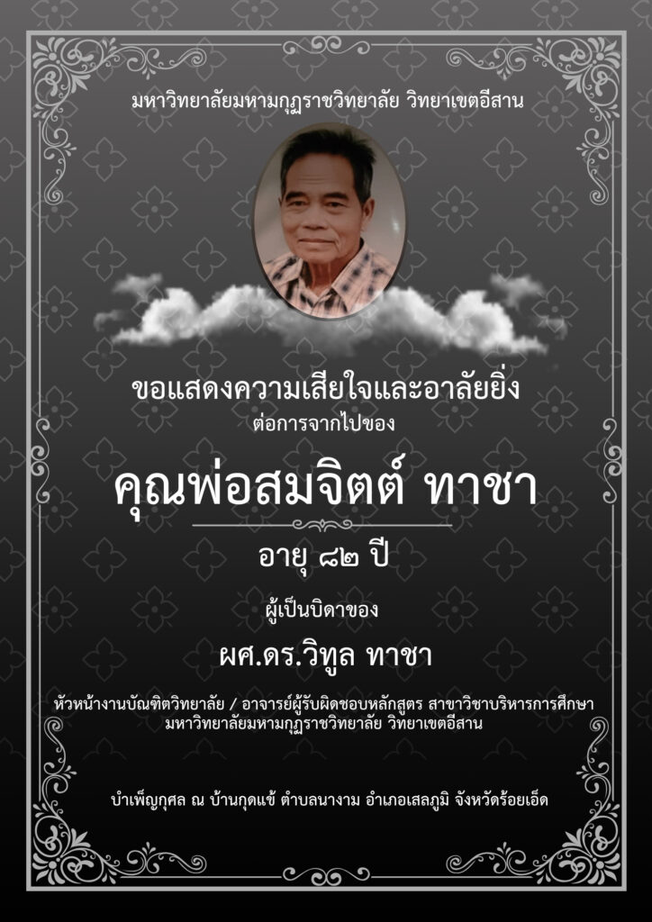 มหาวิทยาลัยมหามกุฏราชวิทยาลัย วิทยาเขตอีสาน ขอแสดงความเสียใจและอาลัยยิ่ง ต่อการจากไปของ คุณพ่อสมจิตต์ ทาชา ผู้เป็นบิดาของ ผศ.ดร.วิทูล ทาชา หัวหน้างานบัณฑิต/อาจารย์ผู้รับผิดชอบหลักสูตร สาขาวิชาบริหารการศึกษา มหาวิทยาลัยมหามกุฏราชวิทยาลัย วิทยาเขตอีสาน บำเพ็ญกุศล ณ บ้านกุดแข้ ตำบลนางาม อำเภอเสลภูมิ จังหวัดร้อยเอ็ด