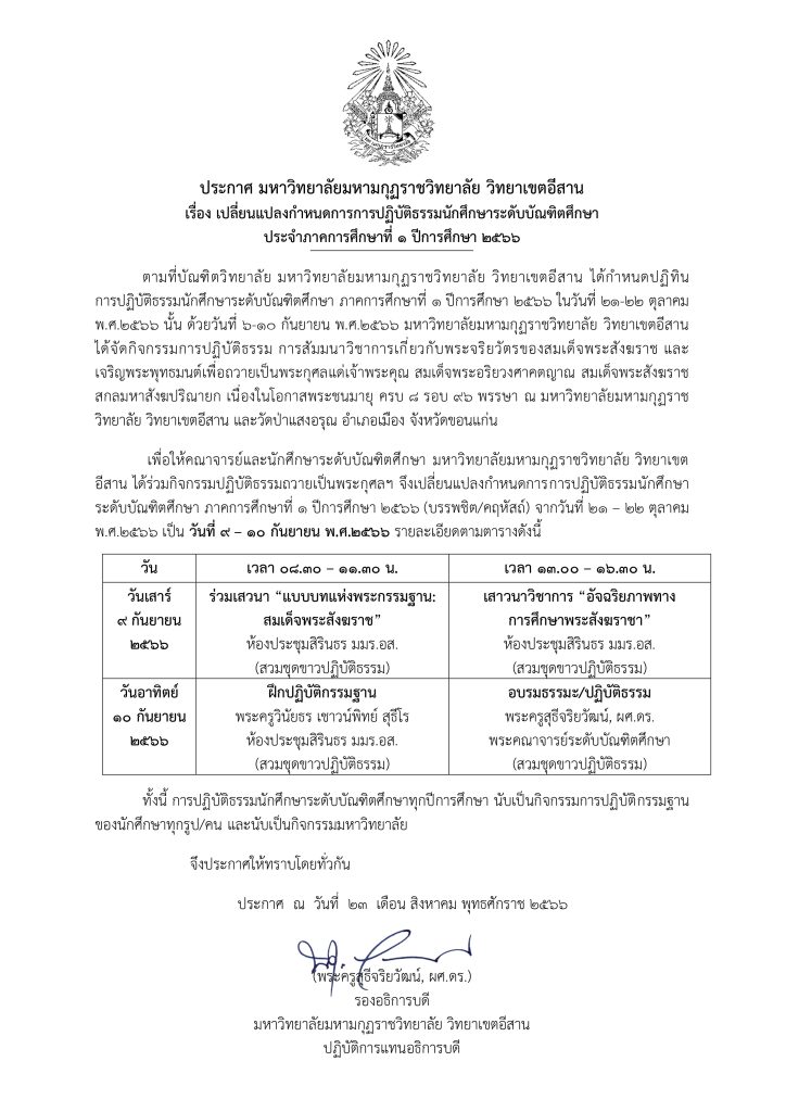 เพื่อให้คณาจารย์และนักศึกษาระดับบัณฑิตศึกษา มหาวิทยาลัยมหามกุฏราชวิทยาลัย วิทยาเขตอีสาน ได้ร่วมกิจกรรมปฏิบัติธรรมถวายเป็นพระกุศลฯ จึงเปลี่ยนแปลงการปฏฺิบัติธรรมระดับบัณฑิตศึกษา ภาคการศึกษาที่ 1/2566 เป็นวันที่ 9-10 กันยายน 2566