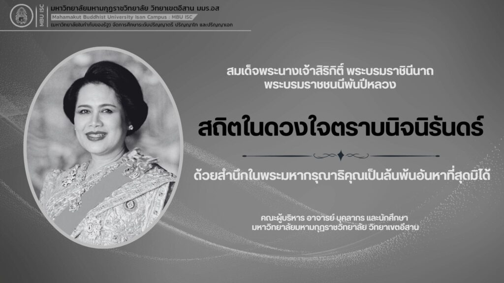 ขอน้อมถวายอาลัย พระผู้เสด็จสู่สวรรคาลัย ด้วยสำนึกในพระมหากรุณาธิคุณอันหาที่สุดมิได้ สมเด็จพระนางเจ้าสิริกิติ์ พระบรมราชินีนาถ พระบรมราชชนนีพันปีหลวง คณะผู้บริหาร อาจารย์ บุคลากร และนักศึกษา มหาวิทยาลัยมหามกุฏราชวิทยาลัย วิทยาเขตอีสาน
