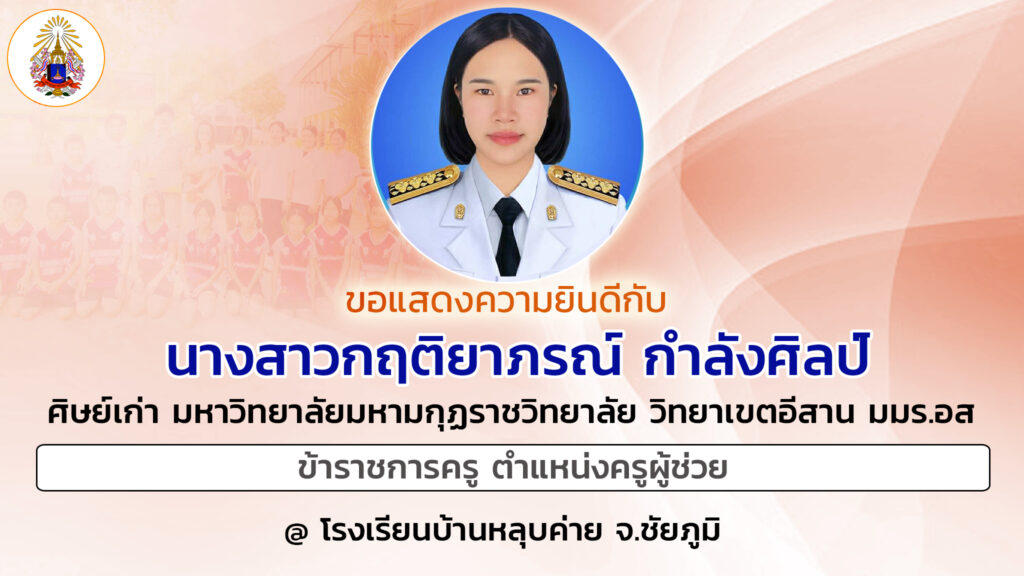 ขอแสดงความยินดีกับ นางสาวกฤติยาภรณ์ กำลังศิลป์ ศิษย์เก่ามหาวิทยาลัยมหามกุฏราชวิทยาลัย วิทยาเขตอีสาน มมร.อส จ.ขอนแก่น บรรจุเป็นข้าราชการครู ตำแหน่งครูผู้ช่วย @โรงเรียนบ้านหลุบค่าย จ.ชัยภูมิ