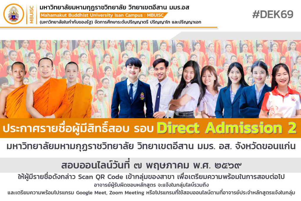 ตามที่ มหาวิทยาลัยมหามกุฏราชวิทยาลัย วิทยาเขตอีสาน ได้เปิดรับสมัครบุคคลเพื่อเข้าศึกษาต่อในระดับปริญญาตรี ประจำปีการศึกษา 2569 ไปแล้วนั้น จึงขอประกาศให้บุคคลผู้มีรายชื่อแนบท้ายประกาศนี้ เป็นผู้มีสิทธิ์สอบ เพื่อเข้าศึกษาต่อในมหาวิทยาลัยมหามกุฏราชวิทยาลัย วิทยาเขตอีสาน ทั้งนี้ ให้ผู้มีรายชื่อตามประกาศทำการสอบแบบออนไลน์ วันที่ 7 พฤษภาคม พ.ศ. 2569 อาจารย์ผู้รับผิดชอบหลักสูตรจะเป็นผู้ชี้แจง วันสอบ และรูปแบบการสอบ ในกลุ่มไลน์แต่ละสาขา ตามกลุ่ม QR-Code รายชื่อผู้มีสิทธิ์สอบแต่ละสาขา รายละเอียดตามปฏิทินดำเนินการที่แจ้งแล้วนั้น