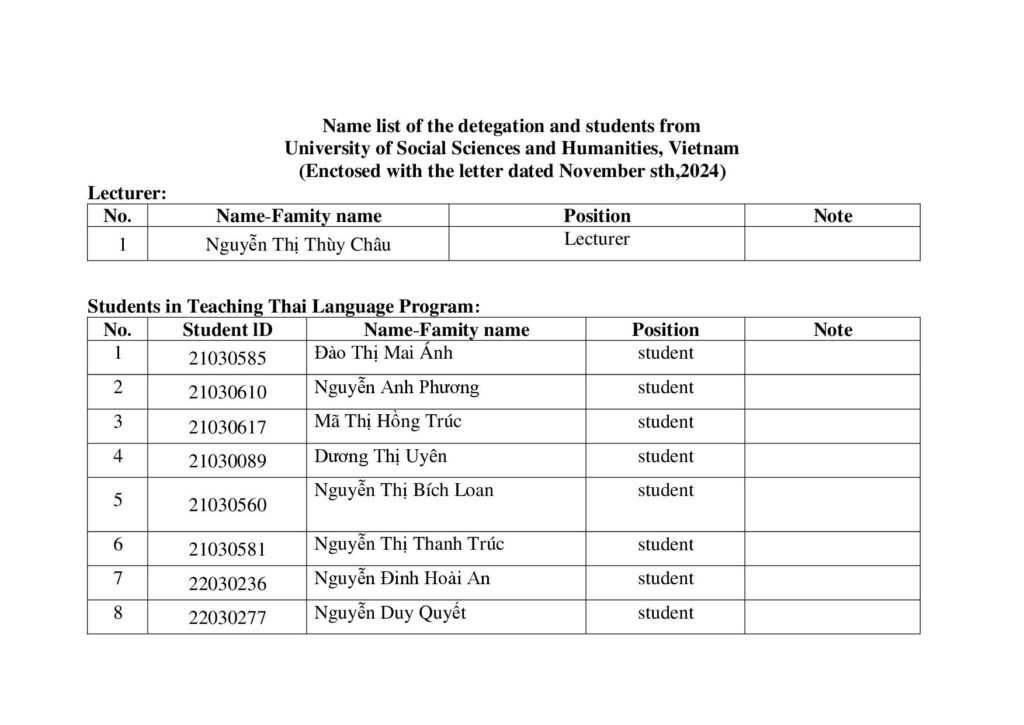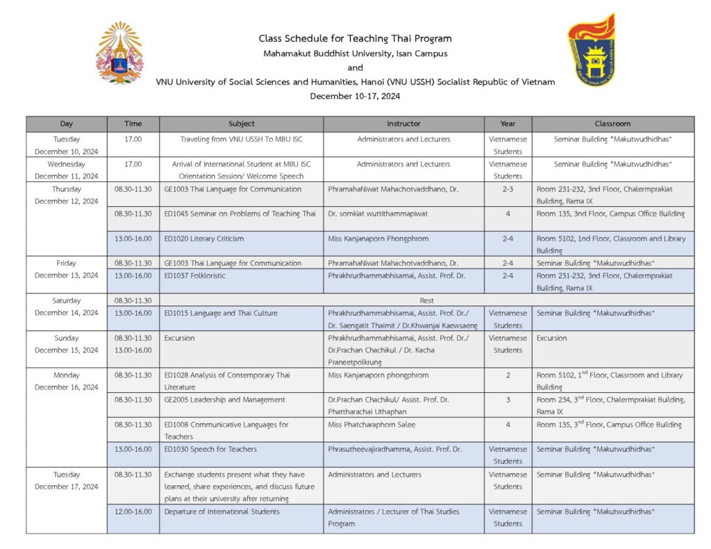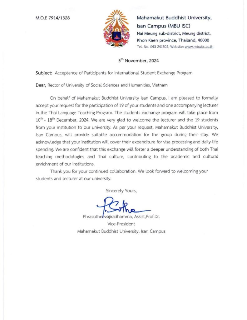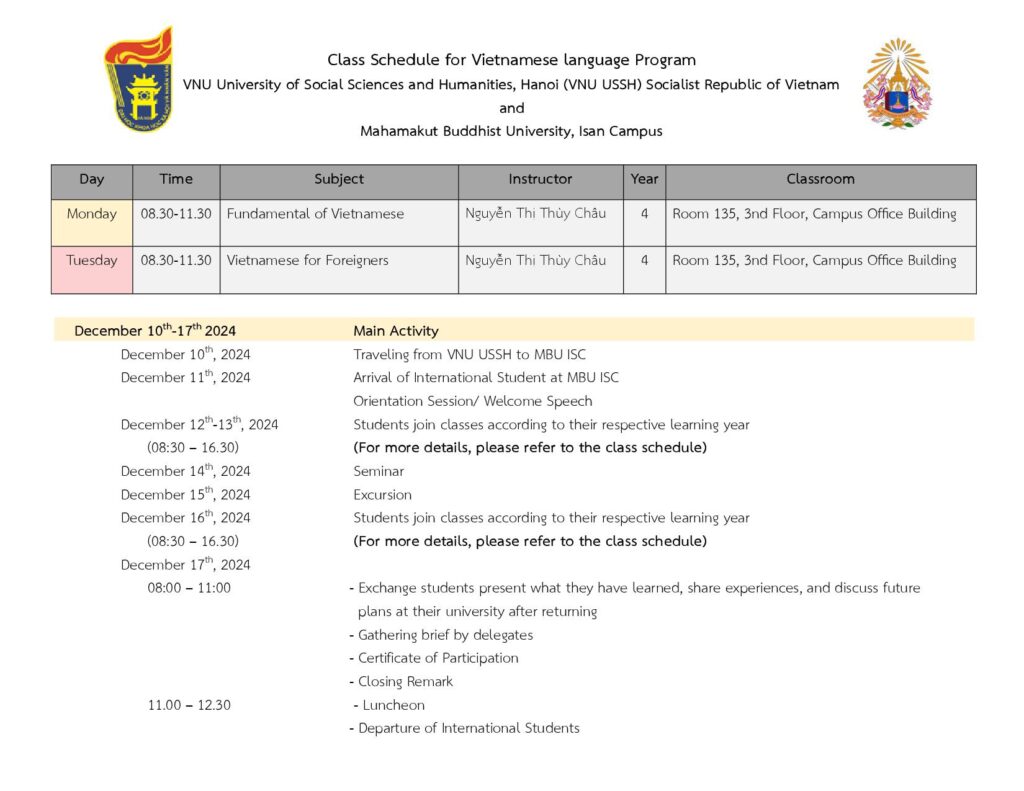 Welcome Exchange Student from VNU University of Social Sciences and Humanities,Hanoi (VNU USSH) Socialist Republic of Vietnam to Mahamakut Buddhist University Isan Campus, Thailand. December 10-17, 2024. Download Class Schedule and Documents