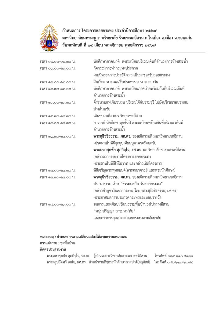 กำหนดการ ลอยกระทง ประจำปีการศึกษา 2567 มหาวิทยาลัยมหามกุฏราชวิทยาลัย วิทยาเขตอีสาน วันพฤหัสบดีที่ 14 พฤศจิกายน 2567