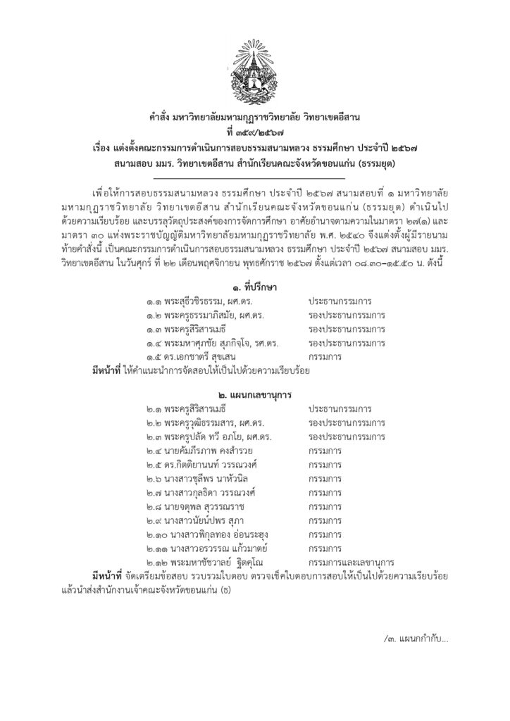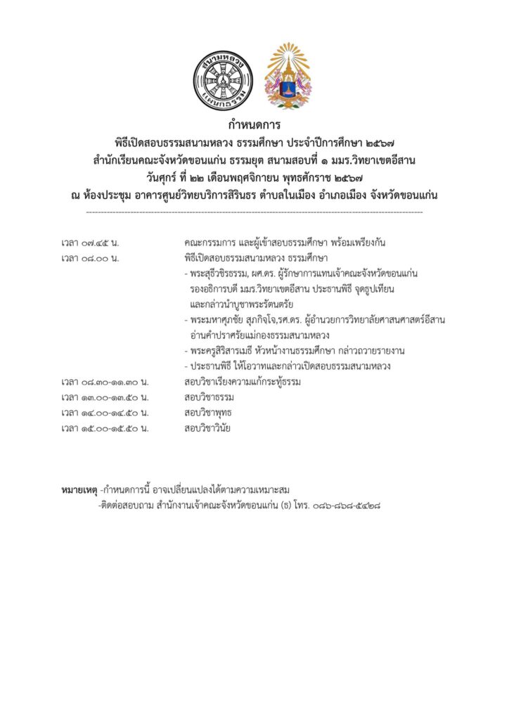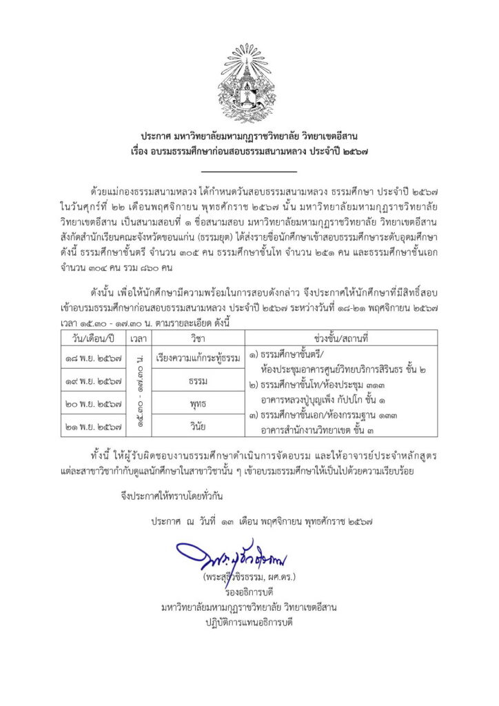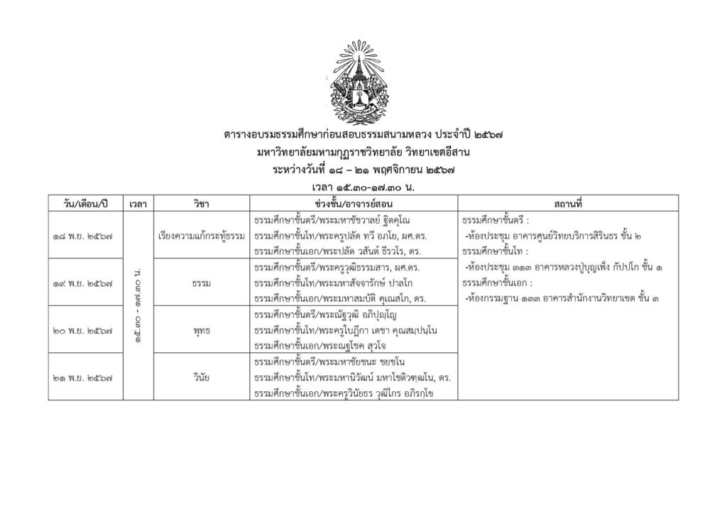 ตารางอบรมเข้มธรรมศึกษา 2567 มหาวิทยาลัยมหามกุฏราชวิทยาลัย วิทยาเขตอีสาน ระหว่างวันที่ 18-21 พฤศจิกายน 2567