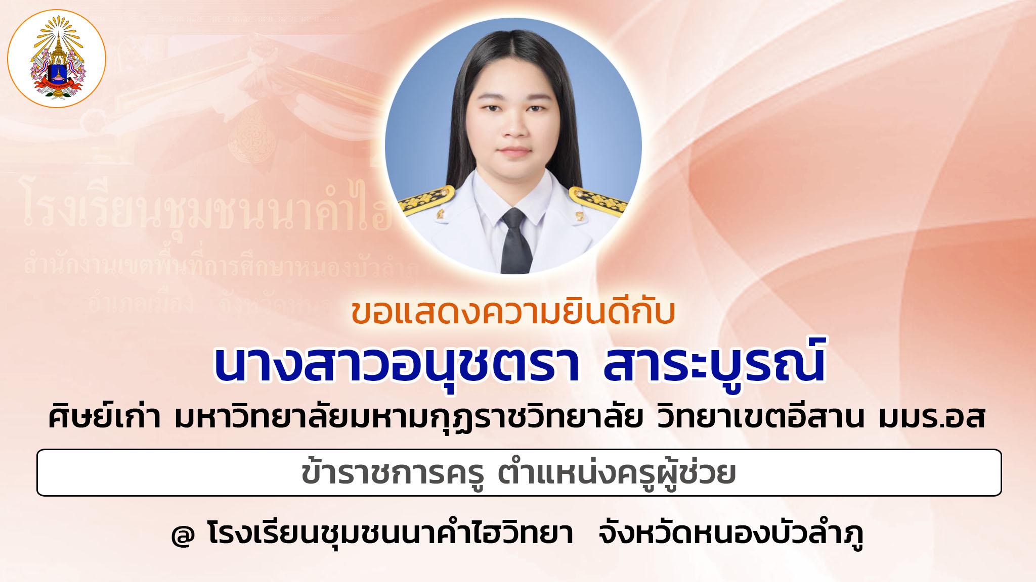 ขอแสดงความยินดีกับ นางสาวอนุชตรา สาระบูรณ์ ศิษย์เก่ามหาวิทยาลัยมหามกุฏราชวิทยาลัย วิทยาเขตอีสาน มมร.อส จ.ขอนแก่น บรรจุเป็นข้าราชการครู ตำแหน่งครูผู้ช่วย @โรงเรียนชุมชนนาคำไฮวิทยา…