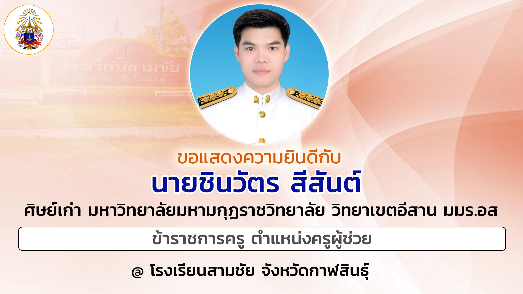 ขอแสดงความยินดีกับ นายชินวัตร สีสันต์ ศิษย์เก่ามหาวิทยาลัยมหามกุฏราชวิทยาลัย วิทยาเขตอีสาน มมร.อส บรรจุเป็นข้าราชการครู ตำแหน่งครูผู้ช่วย @โรงเรียนสามชัย จ.กาฬสินธุ์