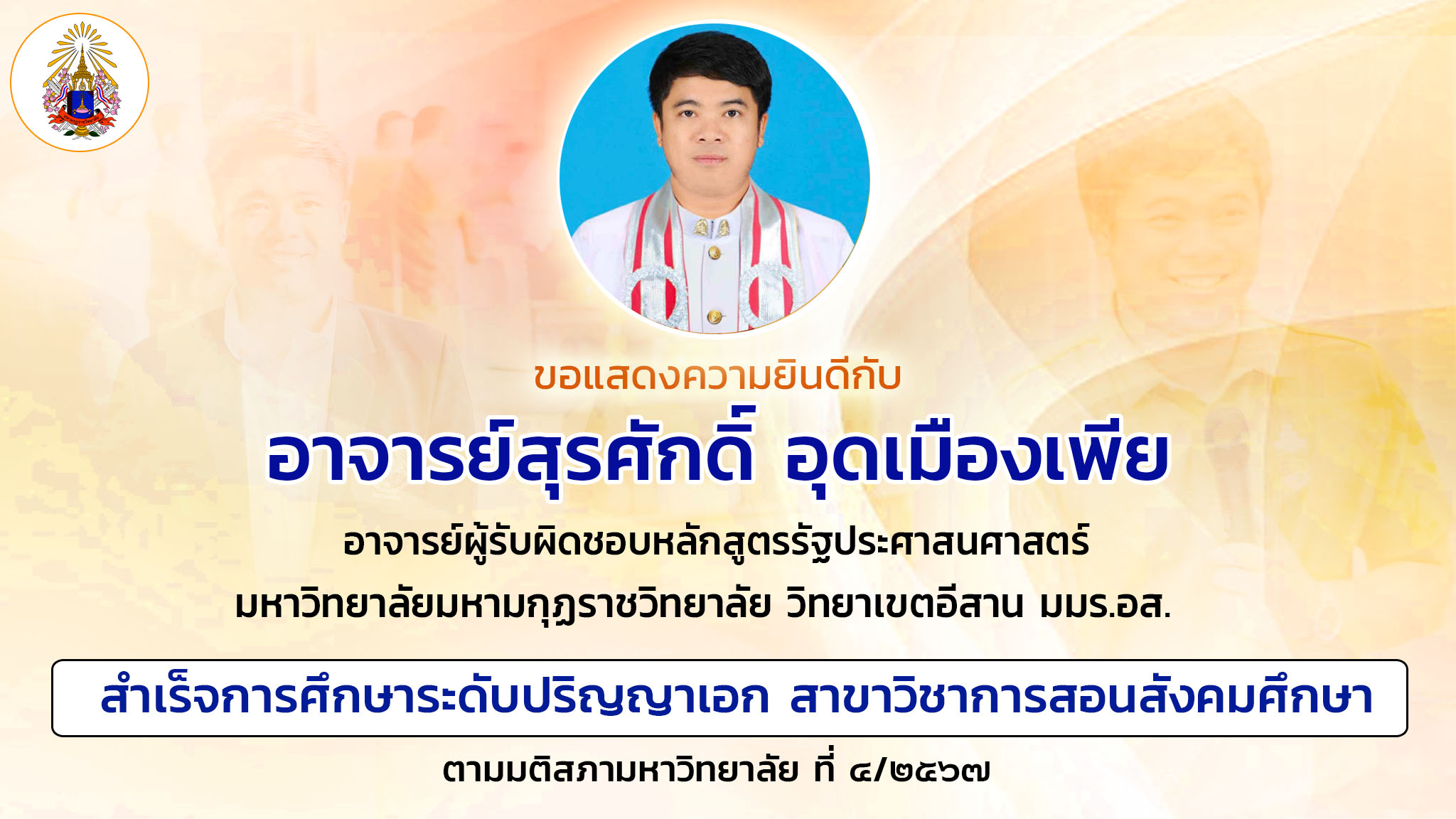 ขอแสดงความยินดีกับ อาจารย์สุรศักดิ์ อุดเมืองเพีย อาจารย์ผู้รับผิดชอบหลักสูตรรัฐประศาสนศาสตร์ มหาวิทยาลัยมหามกุฏราชวิทยาลัย วิทยาเขตอีสาน สำเร็จการศึกษาระดับปริญญาเอก สาขาวิชาการสอนสังคมศึกษา ตามมติสภามหาวิทยาลัยที่ 4/2567