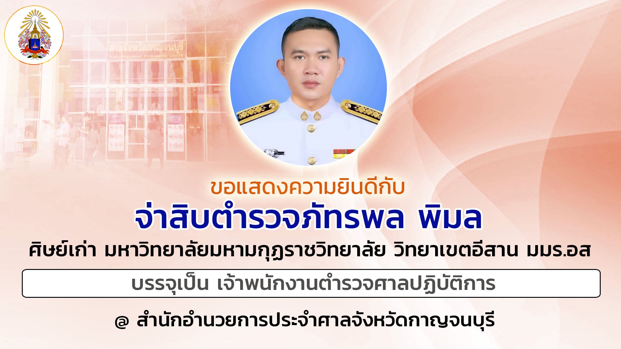 ขอแสดงความยินดีกับ จ่าสิบตำรวจภัทรพล พิมล ศิษย์เก่ามหาวิทยาลัยมหามกุฏราชวิทยาลัย วิทยาเขตอีสาน มมร.อส จ.ขอนแก่น บรรจุเป็นเจ้าพนักงานตำรวจศาลปฏิบัติการ @ สำนักอำนวยการประจำศาลจังหวัดกาญจนบุรี