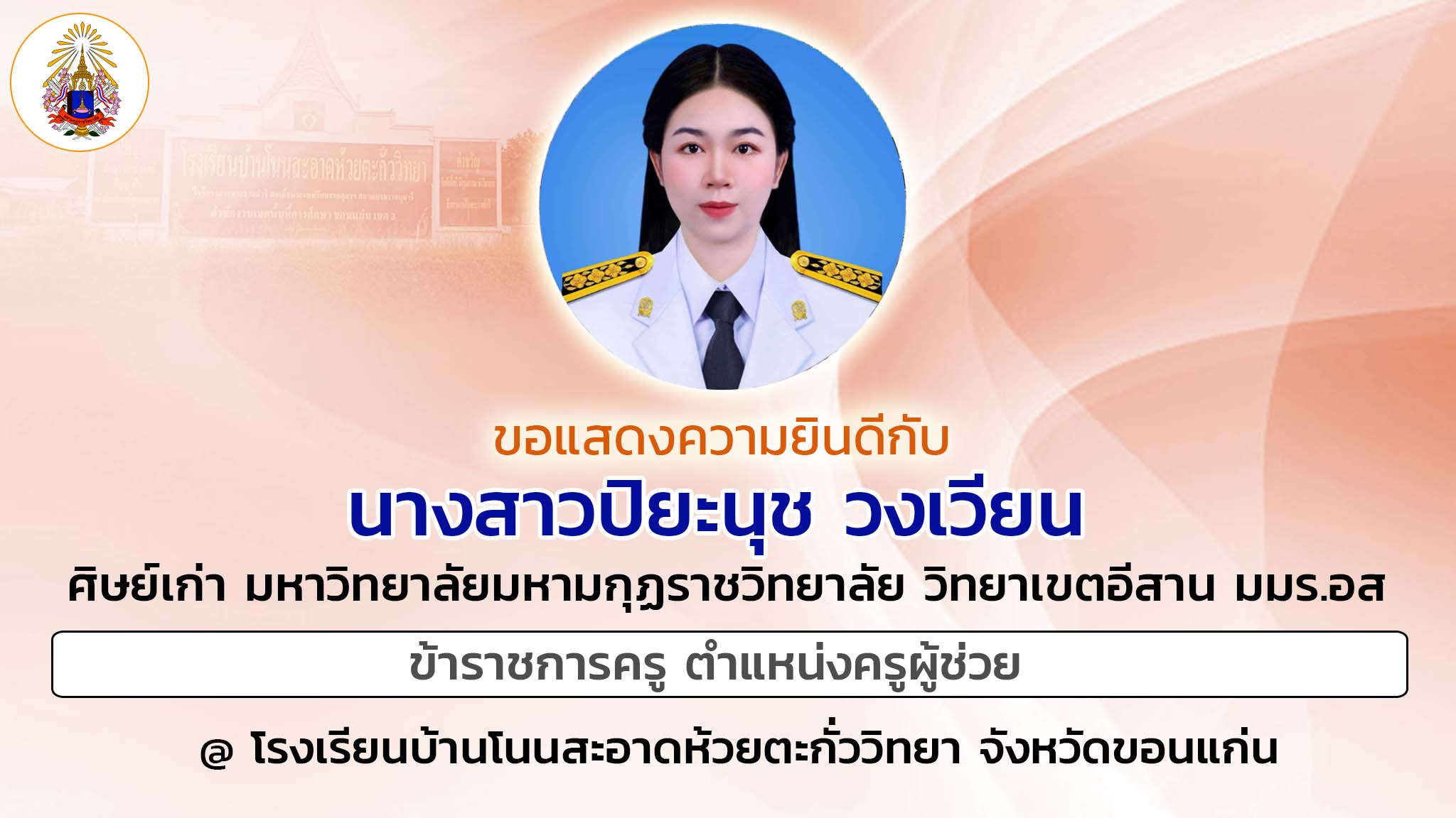ขอแสดงความยินดีกับ นางสาวปิยะนุช วงเวียน ศิษย์เก่ามหาวิทยาลัยมหามกุฏราชวิทยาลัย วิทยาเขตอีสาน มมร.อส จ.ขอนแก่น บรรจุเป็นข้าราชการครู ตำแหน่งครูผู้ช่วย @โรงเรียนบ้านโนนสะอาดห้วยตะกั่ววิทยา…