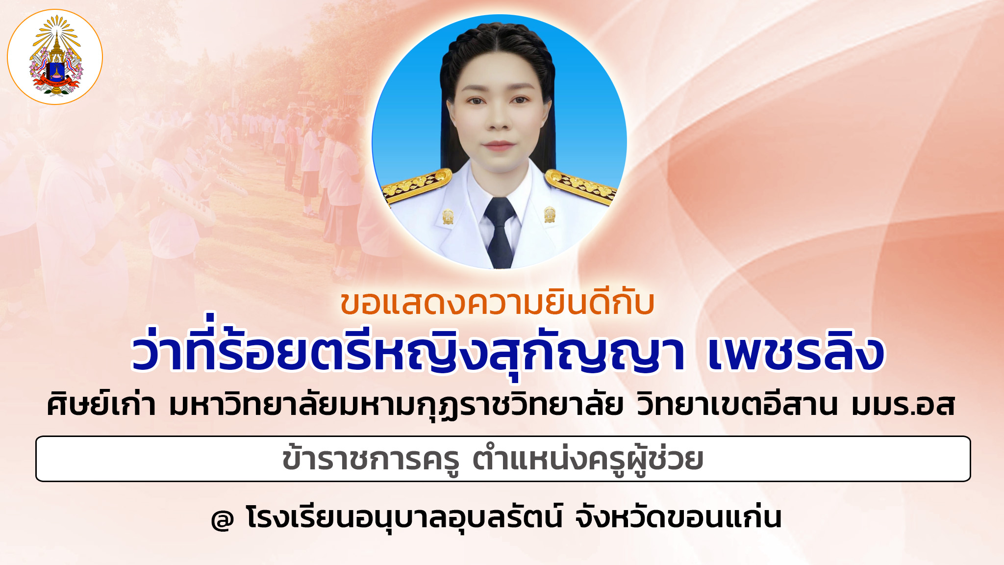 ขอแสดงความยินดีกับ นางสาวสุขกัญญา เถื่อนบัวระบัติ ศิษย์เก่า มหาวิทยาลัยมหามกุฏราชวิทยาลัย วิทยาเขตอีสาน มมร.อส จ.ขอนแก่น บรรจุเป็นข้าราชการครู :…