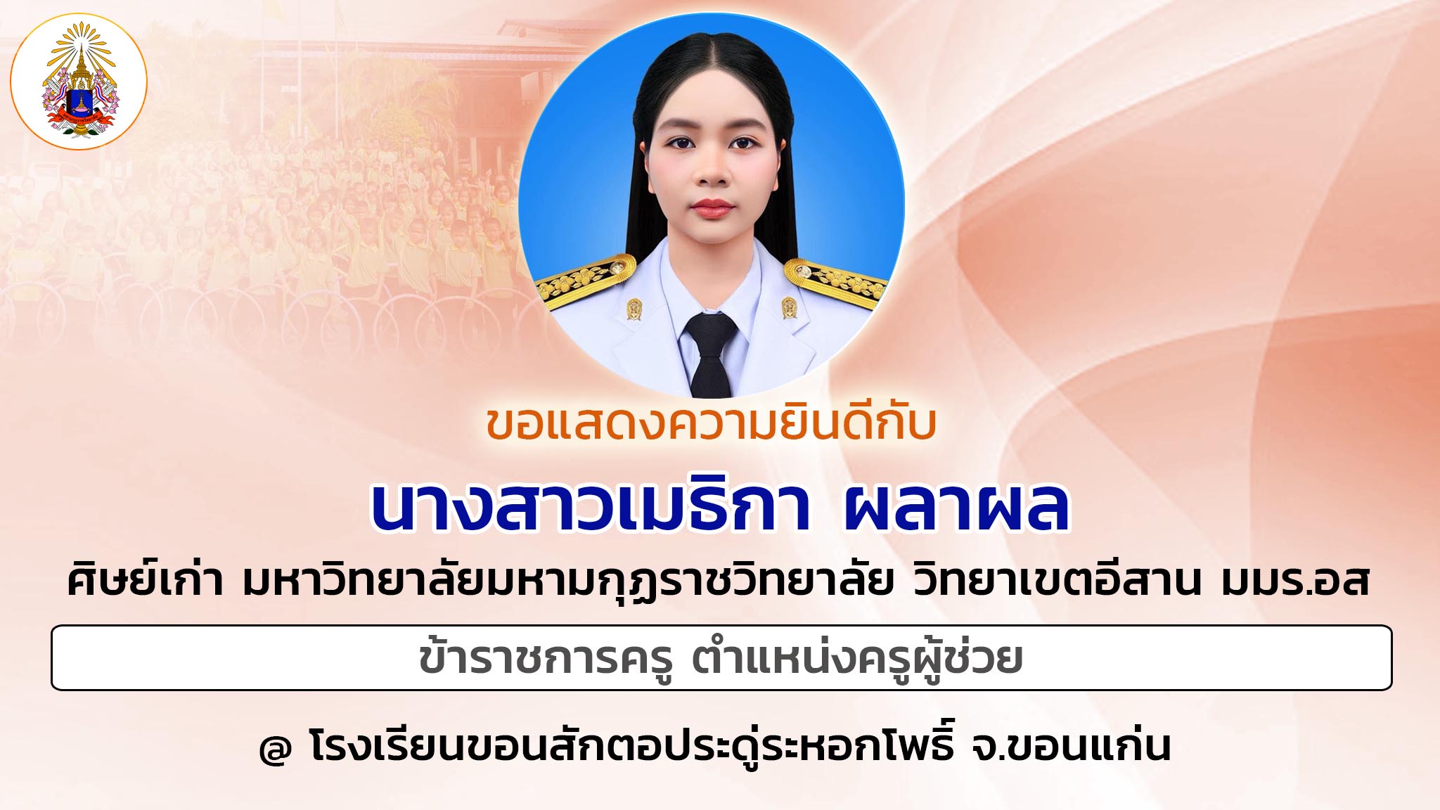 ขอแสดงความยินดีกับ นางสาวเมธิกา ผลาผล ศิษย์เก่ามหาวิทยาลัยมหามกุฏราชวิทยาลัย วิทยาเขตอีสาน มมร.อส จ.ขอนแก่น บรรจุเป็นข้าราชการครู ตำแหน่งครูผู้ช่วย @โรงเรียนขอนสักตอประดู่ระหอกโพธิ์…
