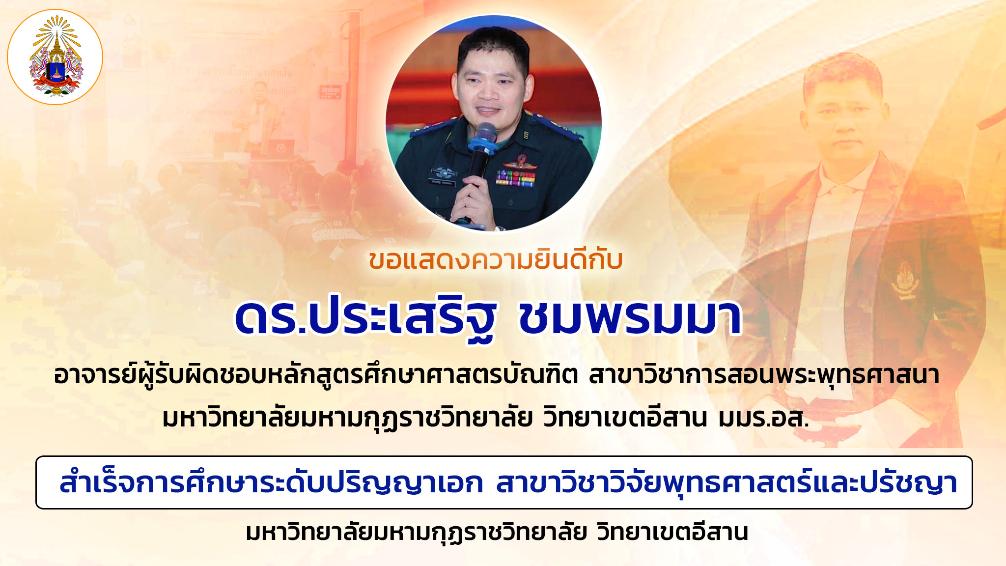 ขอแสดงความยินดีกับ ดร.ประเสริฐ ชมพรมมา อาจารย์ผู้รับผิดขอบหลักสูตรศึกษาศาสตรบัณฑิต สาขาวิชาการสอนพระพุทธศาสนา มหาวิทยาลัยมหามกุฏราชวิทยาลัย วิทยาเขตอีสาน ในโอกาสสำเร็จการศึกษาระดับปริญญาเอก