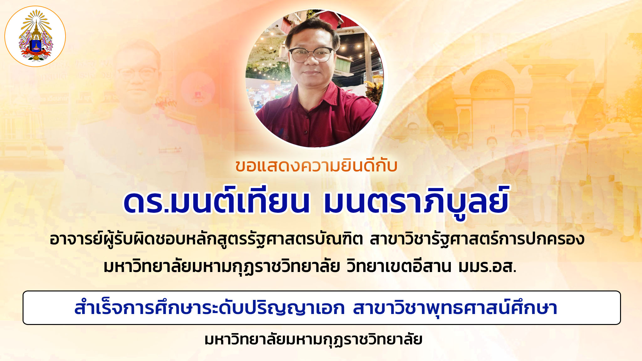 ขอแสดงความยินดีกับ ดร.มนต์เทียน มนตราภิบูลย์ อาจารย์ผู้รับผิดขอบหลักสูตรรัฐศาสตรบัณฑิต สาขาวิชารัฐศาสตร์การปกครอง มหาวิทยาลัยมหามกุฏราชวิทยาลัย วิทยาเขตอีสาน ในโอกาสสำเร็จการศึกษาระดับปริญญาเอก