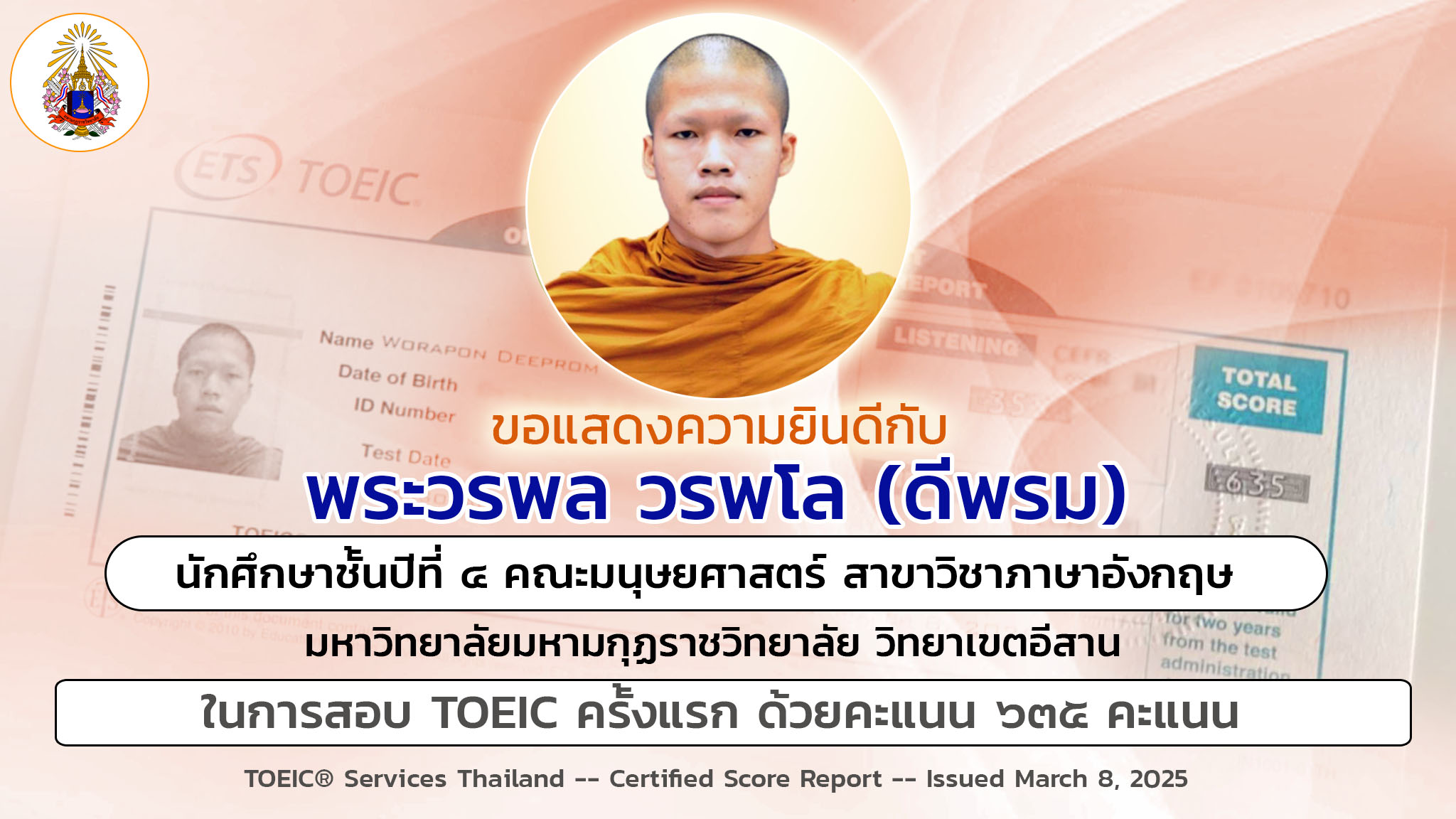 ขอแสดงความยินดีกับ พระวรพล วรพโล (ดีพรม) นักศึกษาชั้นปีที่ 4 คณะมนุษยศาสตร์ สาขาวิชาภาษาอังกฤษ มหาวิทยาลัยมหามกุฏราชวิทยาลัย วิทยาเขตอีสาน…