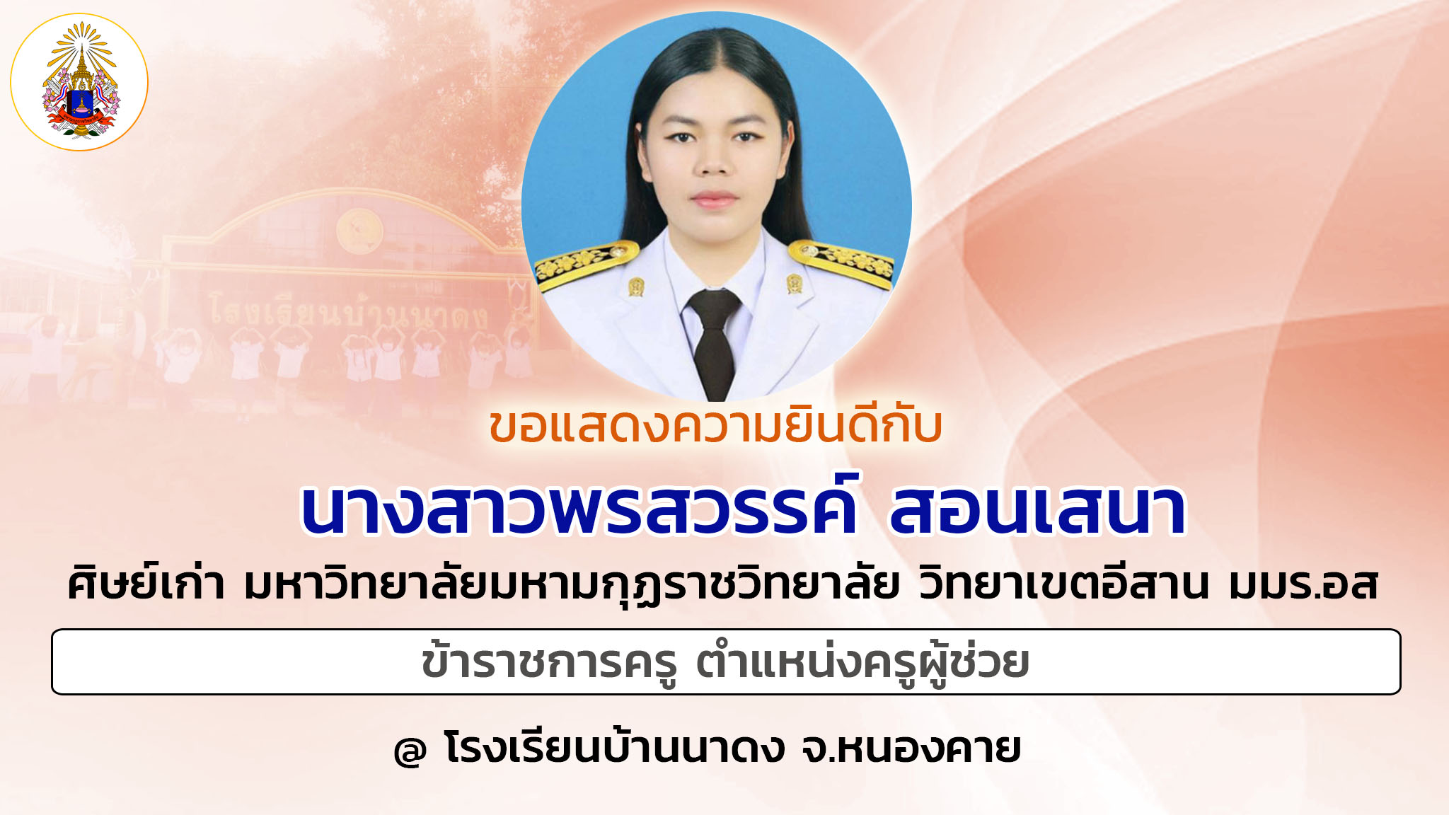 ขอแสดงความยินดีกับ นางสาวพรสวรรค์ สอนเสนา ศิษย์เก่ามหาวิทยาลัยมหามกุฏราชวิทยาลัย วิทยาเขตอีสาน มมร.อส จ.ขอนแก่น บรรจุเป็นข้าราชการครู ตำแหน่งครูผู้ช่วย @โรงเรียนบ้านนาดง…