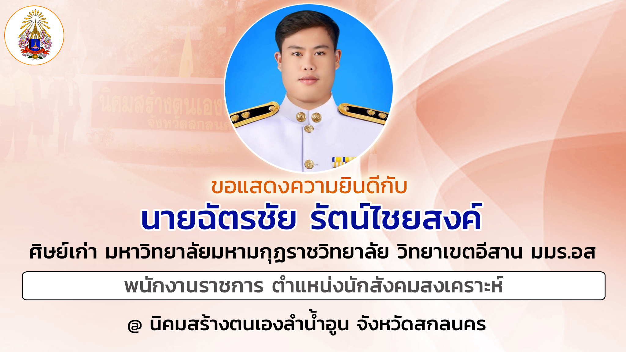 ขอแสดงความยินดีกับ นายฉัตรชัย รัตน์ไชยสงค์ ศิษย์เก่ามหาวิทยาลัยมหามกุฏราชวิทยาลัย วิทยาเขตอีสาน มมร.อส จ.ขอนแก่น บรรจุเป็นพนักงานราชการ ตำแหน่งนักสังคมสงเคราะห์ @นิคมสร้างตนเองลำน้ำอูน…