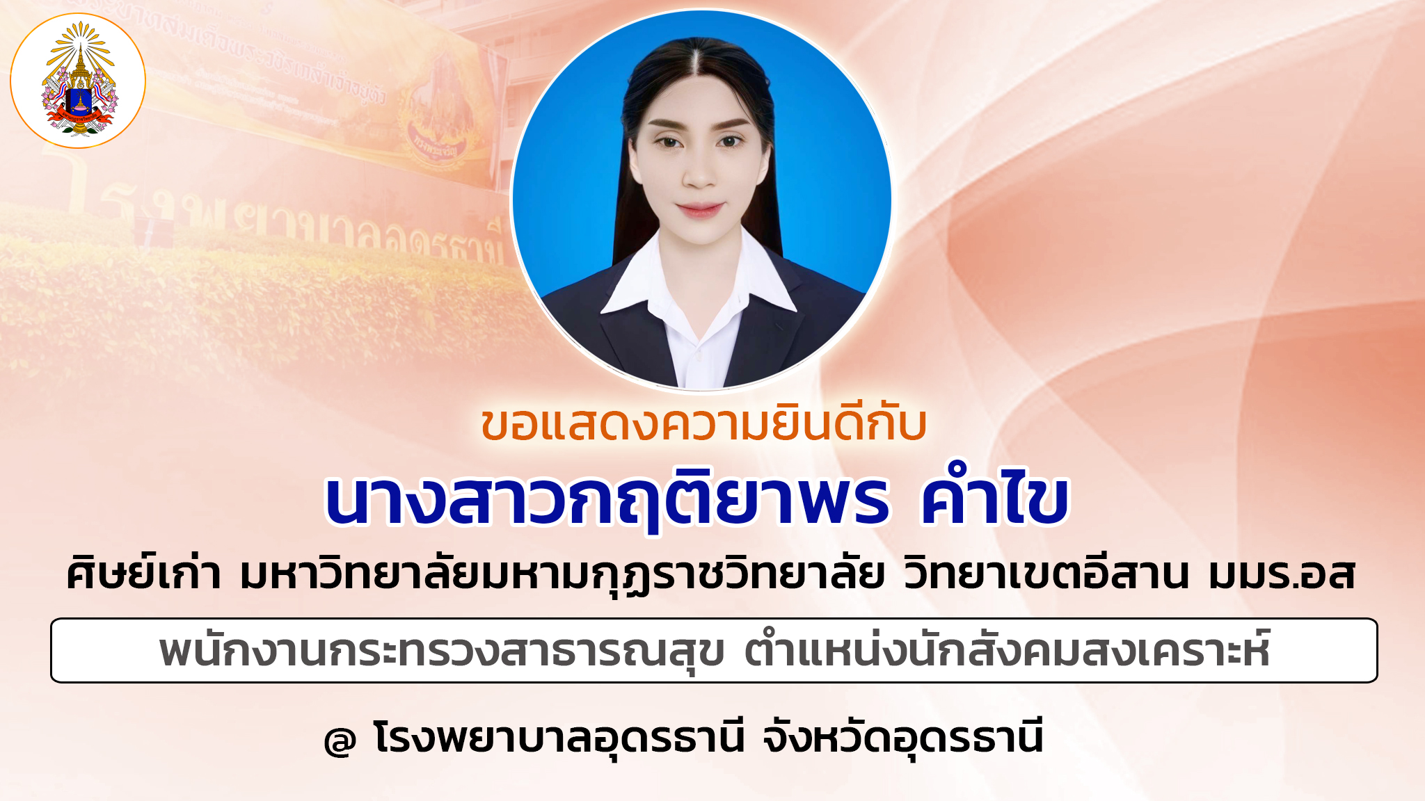ขอแสดงความยินดีกับ นางสาวกฤติยาพร คำไข ศิษย์เก่า มหาวิทยาลัยมหามกุฏราชวิทยาลัย วิทยาเขตอีสาน ในตำแหน่ง พนักงานกระทรวงสาธารณสุข ตำแหน่งนักสังคมสงเคราะห์ โรงพยาบาลอุดรธานี