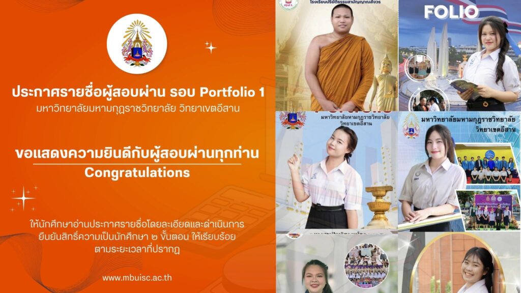 ตามที่ มหาวิทยาลัยมหามกุฏราชวิทยาลัย วิทยาเขตอีสาน ได้ทำการสอบคัดเลือกนักศึกษาใหม่ ประจำปี 2569 (รอบที่ 1 Portfolio) ไปแล้วนั้น จึงขอประกาศให้บุคคลผู้มีรายชื่อแนบท้ายประกาศนี้ เป็นมีสิทธิ์เข้าศึกษาต่อ ทั้งนี้ ให้ผู้มีรายชื่อตามประกาศ ดำเนินการตามหมายเหตุที่ปรากฏท้ายประกาศเพื่อรักษาสิทธิ์ความเป็นนักศึกษา หากไม่ดำเนินการหรือพ้นกำหนดวันดังกล่าวถือว่าสละสิทธิ์ ดาวน์โหลดประกาศรายชื่อผู้สอบผ่าน