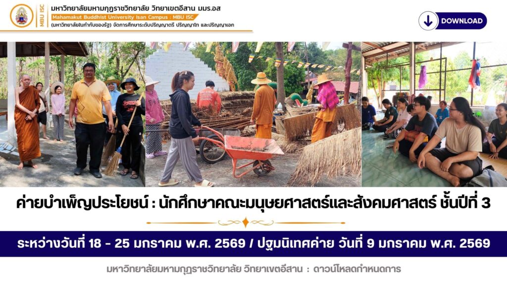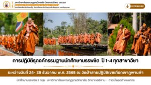 การปฏิบัติธุดงค์กรรมฐานนักศึกษาบรรพชิต ปี 1-4 ทุกสาขาวิชา ระหว่างวันที่ 24- 29 ธันวาคม พ.ศ. 2568 ณ วัดป่าสายปฏิบัติเขตเทือกเขาภูพานคำ นักศึกษาบรรพชิต 2 กลุ่ม : มหาวิทยาลัยมหามกุฏราชวิทยาลัย วิทยาเขตอีสาน : ดาวน์โหลดกำหนดการ