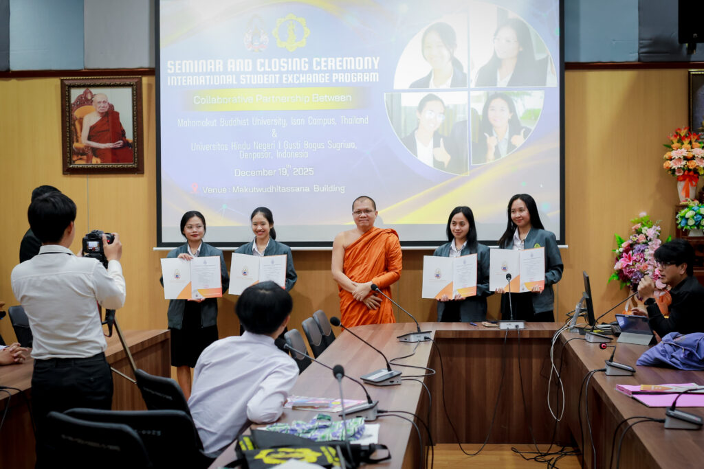 พิธีปิดอำลานักศึกษาแลกเปลี่ยน จากประเทศอินโดนิเซีย ซึ่งนักศึกษามาร่วมเรียนกับนักศึกษาประเทศไทย ณ มหาวิทยาลัยมหามกุฏราชวิทยาลัย วิทยาเขตอีสาน โดย นักศึกษาจากประเทศอินโดนิเซีย ได้นำเสนอความประทับใจ ที่ได้มาเรียนมหาวิทยาลัยมหามกุฏราชวิทยาลัย วิทยาเขตอีสาน ประเทศไทย จากนั้นอาจารย์กล่าวอำลา พระพุทธิวชิรเมธี ผศ.ดร. และ พระมหาศุภชัย สุภกิจฺโจ รศ.ดร. ได้กล่าวอำลาและมอบของที่ระลึก และถ่ายรูปหมู่