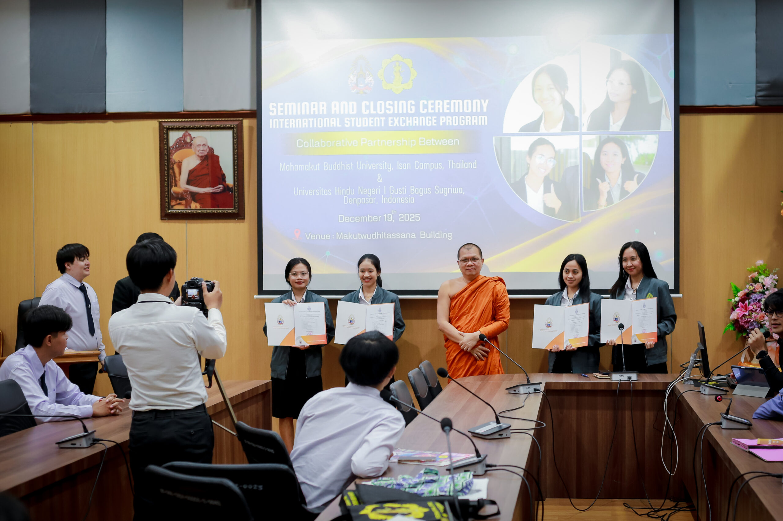พิธีปิดอำลานักศึกษาแลกเปลี่ยน จากประเทศอินโดนิเซีย ซึ่งนักศึกษามาร่วมเรียนกับนักศึกษาประเทศไทย ณ มหาวิทยาลัยมหามกุฏราชวิทยาลัย วิทยาเขตอีสาน โดย นักศึกษาจากประเทศอินโดนิเซีย ได้นำเสนอความประทับใจ ที่ได้มาเรียนมหาวิทยาลัยมหามกุฏราชวิทยาลัย วิทยาเขตอีสาน ประเทศไทย จากนั้นอาจารย์กล่าวอำลา พระพุทธิวชิรเมธี ผศ.ดร. และ พระมหาศุภชัย สุภกิจฺโจ รศ.ดร. ได้กล่าวอำลาและมอบของที่ระลึก และถ่ายรูปหมู่