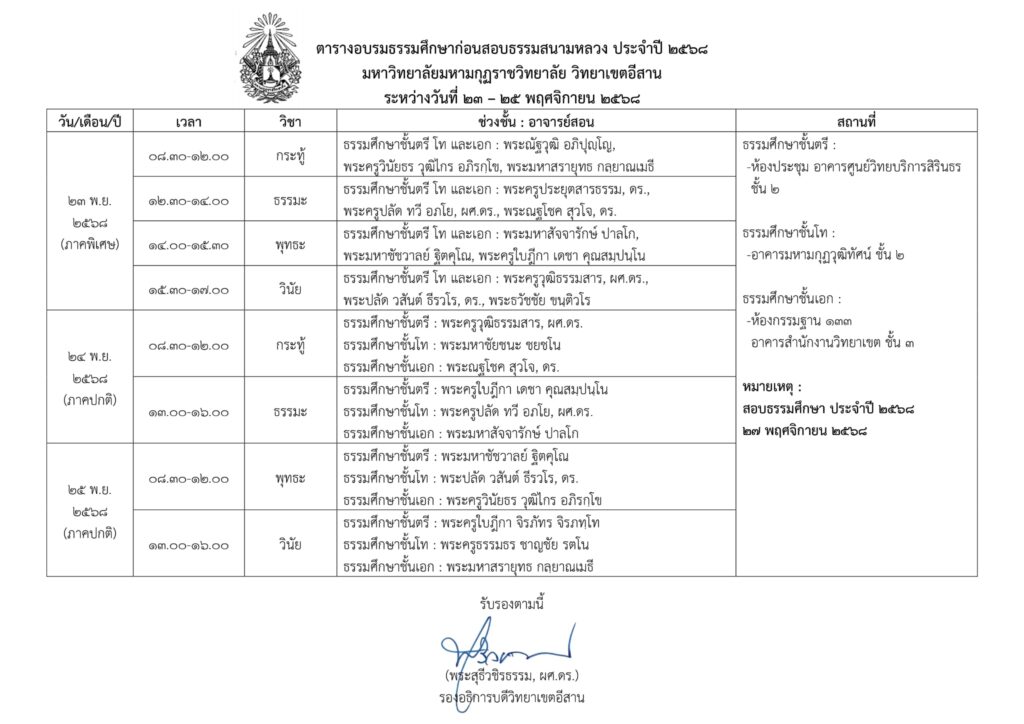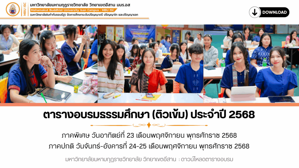 ตารางอบรมเข้มธรรมศึกษา (ติวเข้ม) ประจำปี 2568 มหาวิทยาลัยมหามกุฏราชวิทยาลัย วิทยาเขตอีสาน ภาคปกติ และ ภาคพิเศษ ดังนี้ 1. ภาคพิเศษ อบรมในวันอาทิตย์ที่ 23 พฤศจิกายน 2568 และ ภาคปกติ อบรมวันจันทร์-อังคารที่ 24-25 พฤศจิกายน 2568