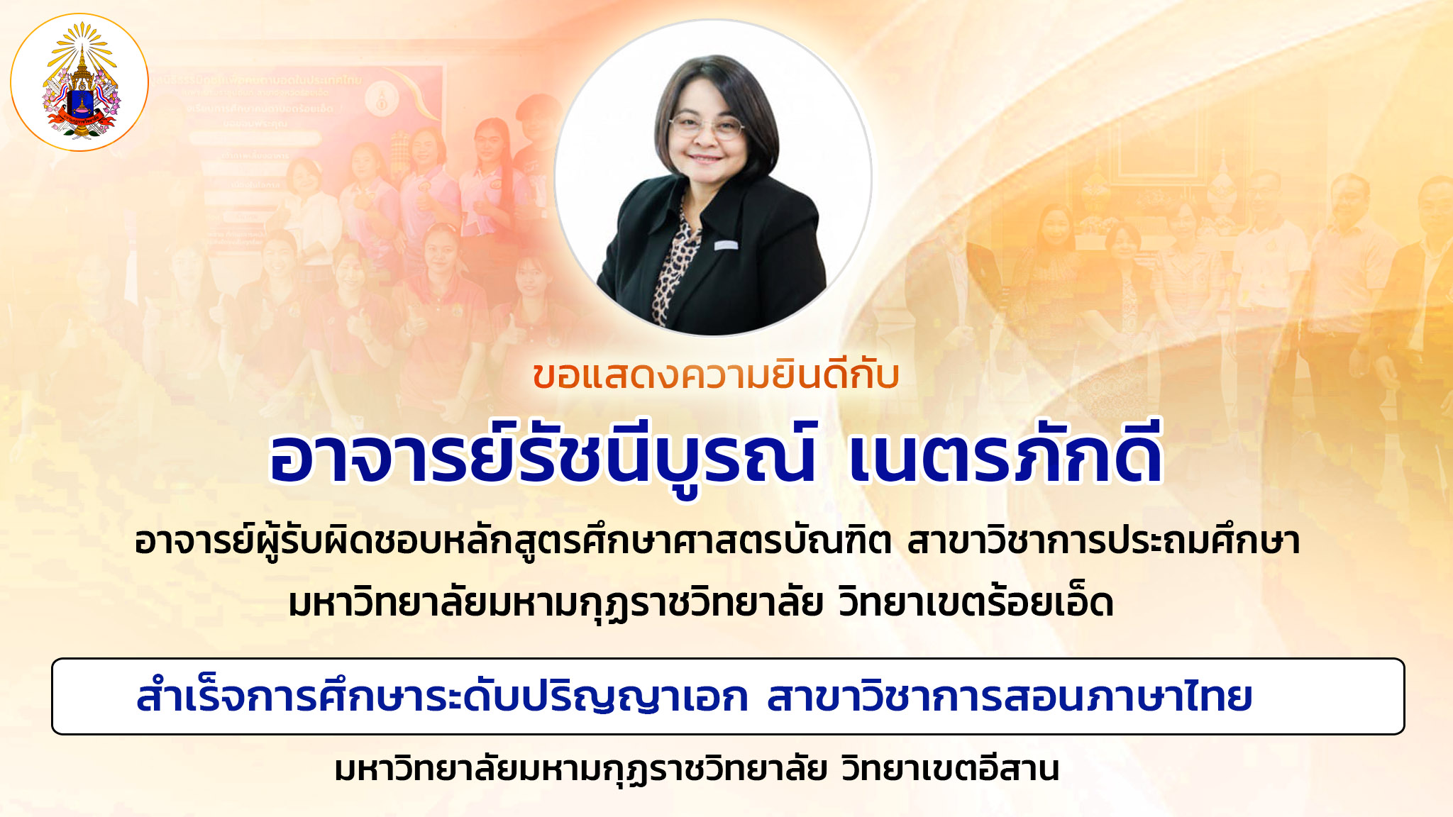 ขอแสดงความยินดีกับ อ.รัชนีบูรณ์ เนตรภักดี อาจารย์ผู้รับผิดชอบหลักสูตรศึกษาศาสตรบัณฑิต สาขาวิชาการประถมศึกษา ในโอกาสสำเร็จการศึกษาระดับปริญญาเอก สาขาวิชาการสอนภาษาไทย มหาวิทยาลัยมหามกุฏราชวิทยาลัย วิทยาเขตอีสาน