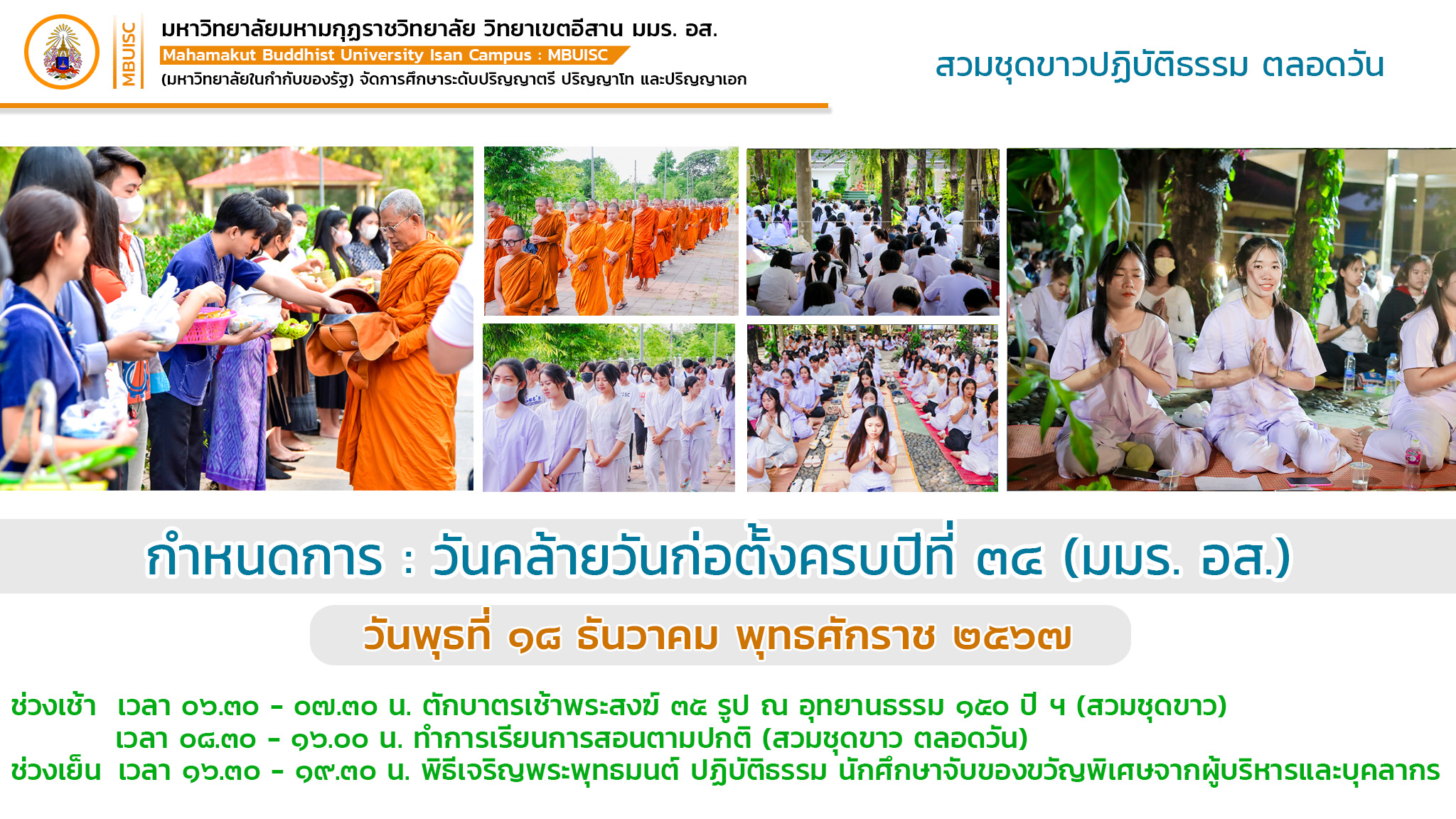 พิธีทำบุญตักบาตร บำเพ็ญกุศลและเจริญพระพุทธมนต์ เนื่องในวันคล้ายวันก่อตั้งครบปีที่ 34 มหาวิทยาลัยมหามกุฏราชวิทยาลัย วิทยาเขตอีสาน ณ อุทยานธรรม 150 ปี…