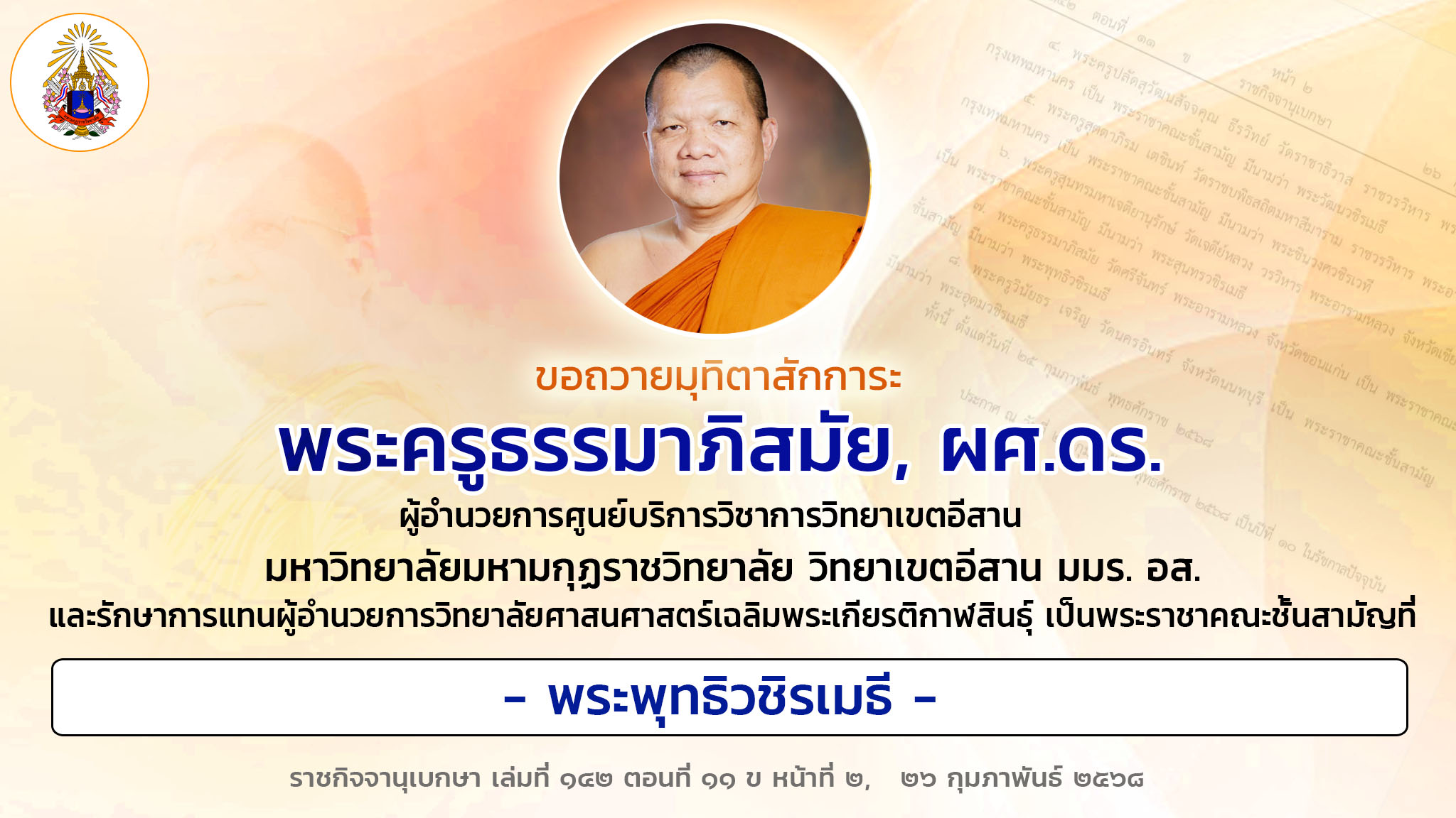 ขอถวายมุทิตาสักการะในโอกาสที่ พระบาทสมเด็จพระเจ้าอยู่หัว ทรงพระกรุณาโปรดพระราชทานสัญญาบัตรเลื่อนและตั้งสมณศักดิ์พระราชาคณะ สังกัดมหาวิทยาลัยมหามกุฏราชวิทยาลัย พระครูธรรมาภิสมัย, ผศ.ดร. ผู้อำนวยการศูนย์บริการวิชาการวิทยาเขตอีสาน รักษาการแทนผู้อำนวยการวิทยาลัยศาสนศาสตร์เฉลิมพระเกียรติกาฬสินธุ์ เป็นพระราชาคณะชั้นสามัญที่ พระพุทธิวชิรเมธี