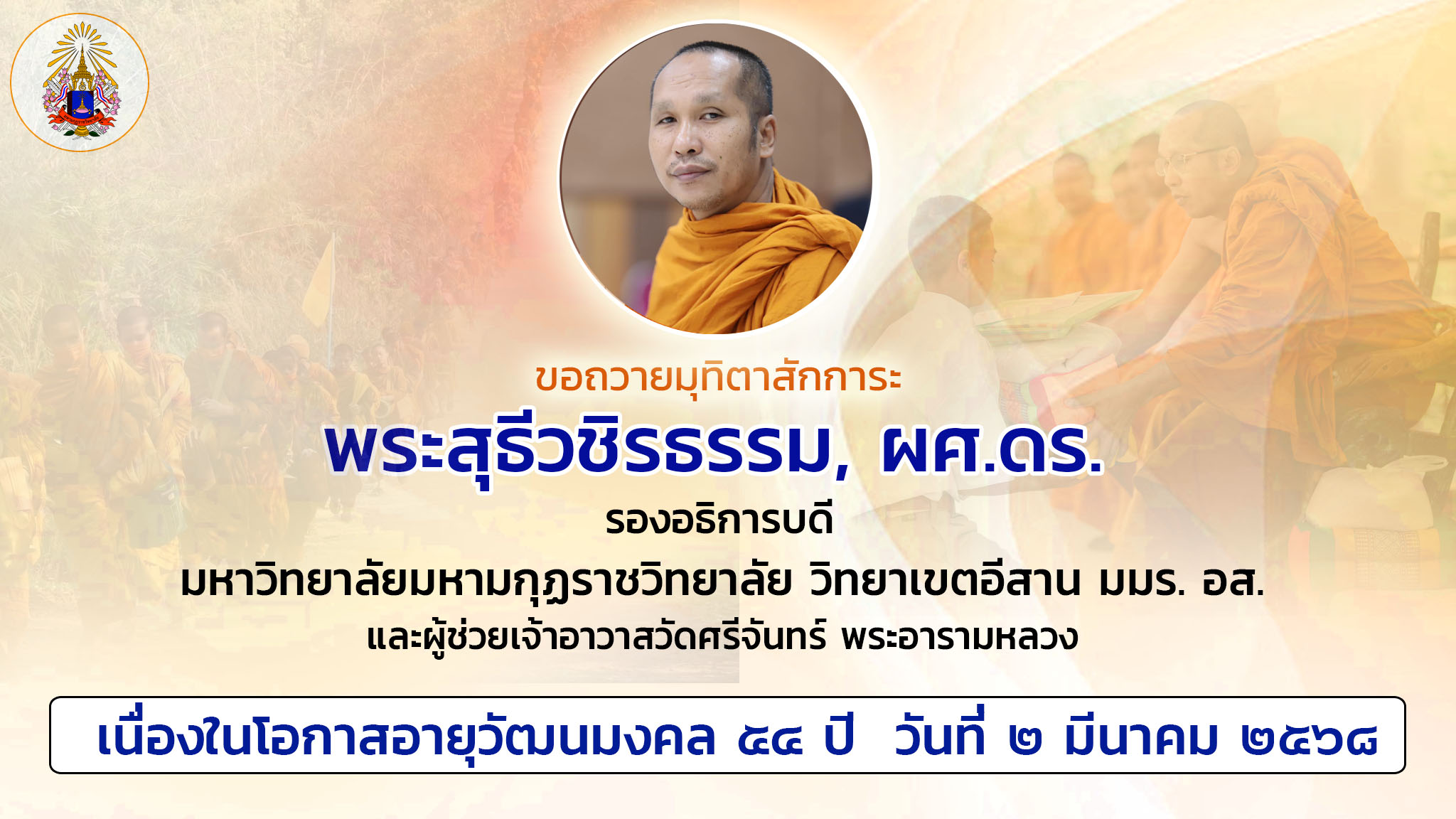 ขอถวายมุทิตาสักการะ พระสุธีวชิรธรรม ผศ.ดร. รองอธิการบดีมหาวิทยาลัยมหามกุฏราชวิทยาลัย วิทยาเขตอีสาน เนื่องในโอกาสอายุวัฒนมงคล 54 ปี วันที่ 2…