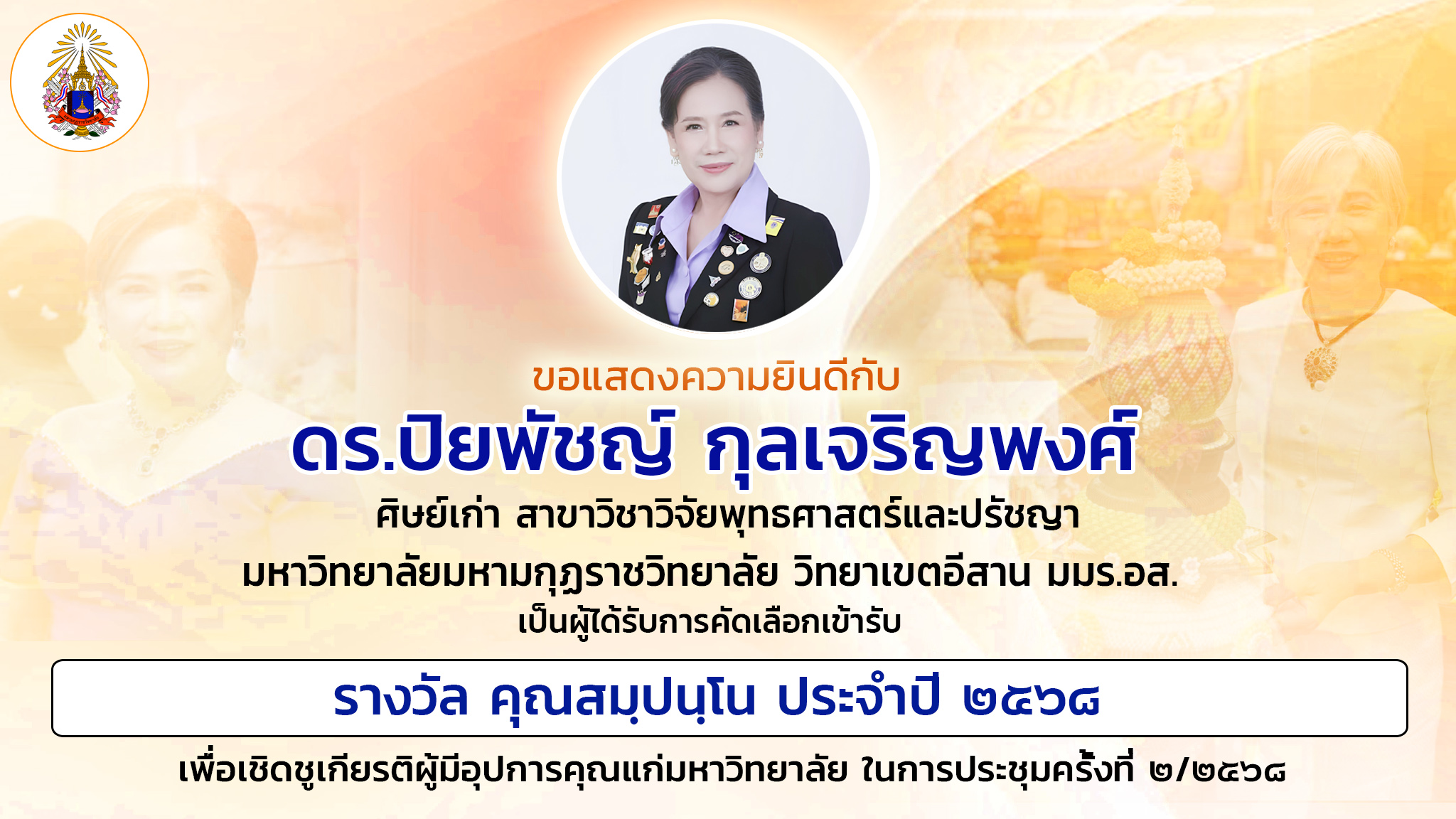 ขอแสดงความยินดีกับ ดร.ปิยพัชญ์ กุลเจริญพงศ์ ศิษย์เก่า สาขาวิชาวิจัยพุทธศาสตร์และปรัชญา มหาวิทยาลัยมหามกุฏราชวิทยาลัย วิทยาเขตอีสาน มมร.อส. เป็นผู้ได้รับการคัดเลือกเข้ารับ รางวัล…