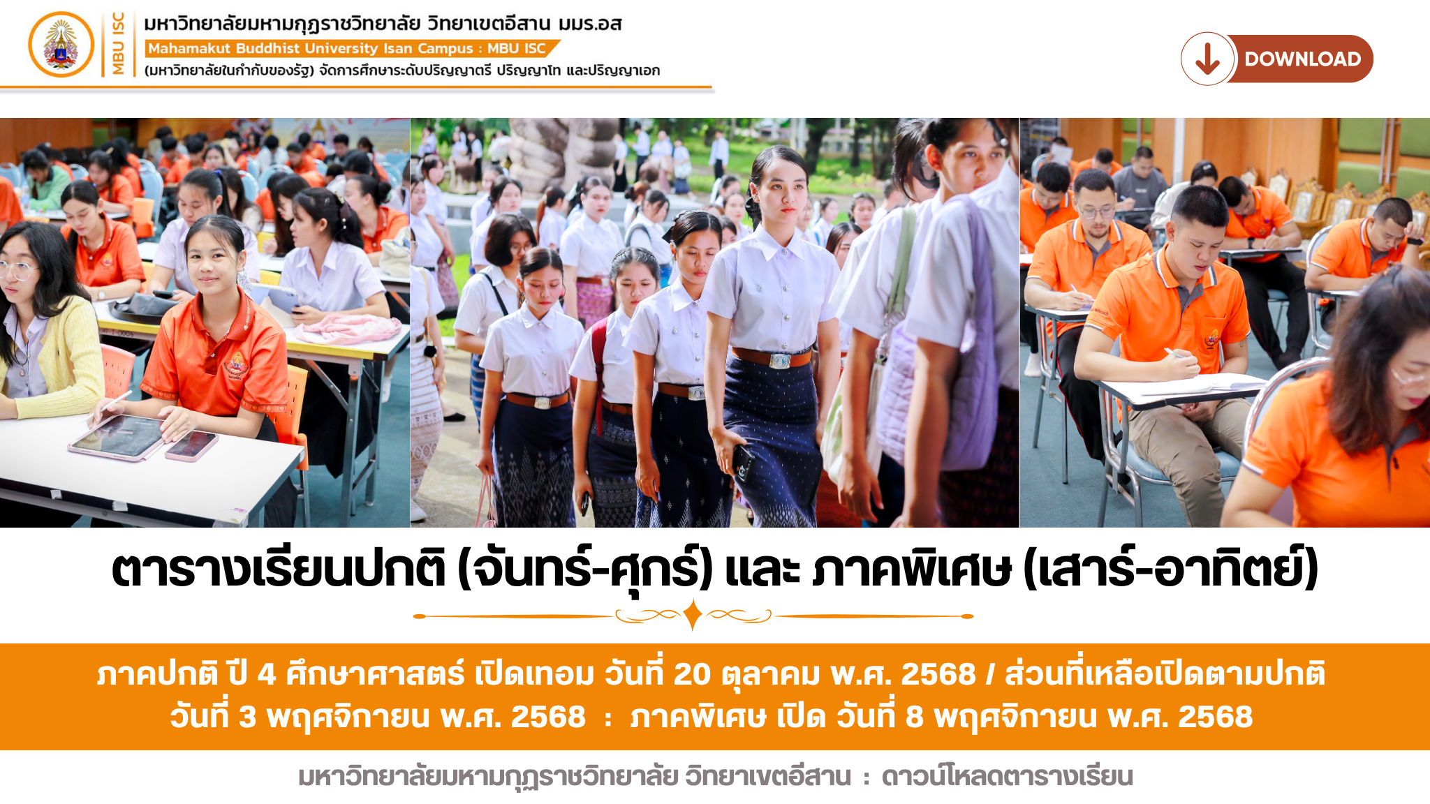 ดาวนโ์หลดตารางเรียน ภาคเรียนที่ 2/2568 มหาวิทยาลัยมหามกุฏราชวิทยาลัย วิทยาเขตอีสาน ภาคปกติ ปี 4 ศึกษาศาสตร์ เปิดเทอม...