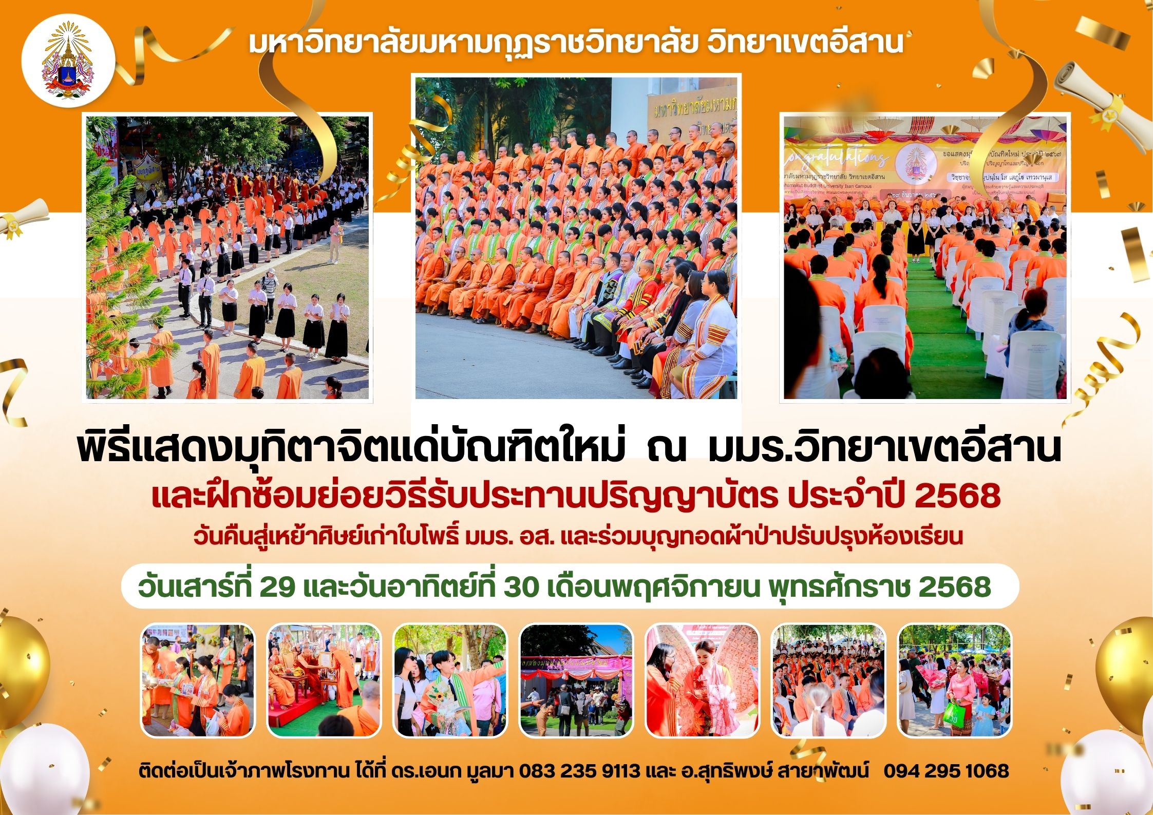กำหนดการ พิธีแสดงมุทิตาจิต แด่ บัณฑิตใหม่ และฝึกซ้อมย่อยวิธีรับประทานปริญญาบัตร ประจำปี 2568 วันคืนสู่เหย้าศิษย์เก่าใบโพธิ์ มมร. อส….