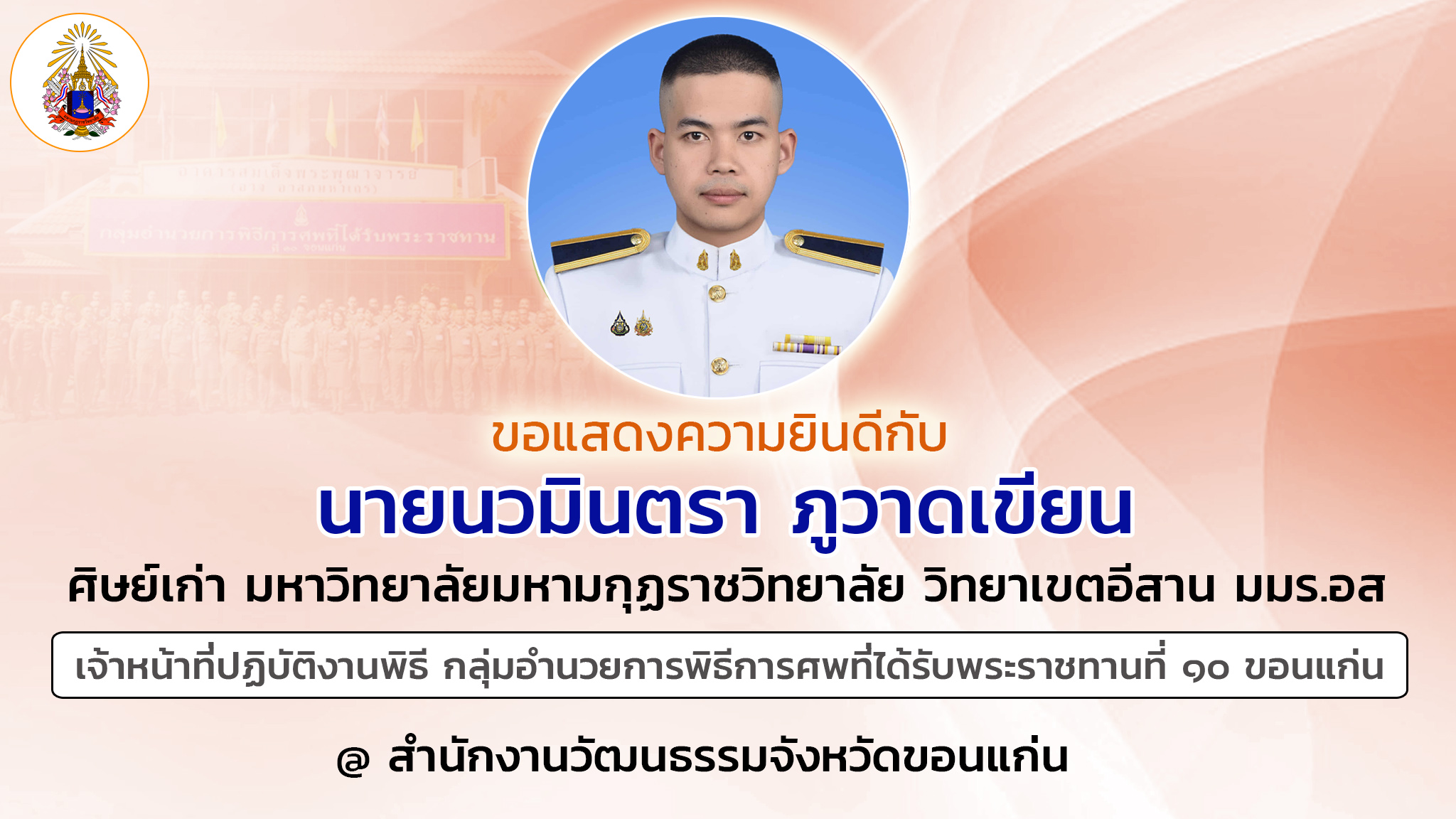 ขอแสดงความยินดีกับ นายนวมินตรา ภูวาดเขียน ศิษย์เก่ามหาวิทยาลัยมหามกุฏราชวิทยาลัย วิทยาเขตอีสาน มมร.อส จ.ขอนแก่น ตำแหน่งเจ้าหน้าที่ปฏิบัติงานพิธี กลุ่มอำนวยการพิธีการศพที่ได้รับพระราชทานที่ ๑๐…