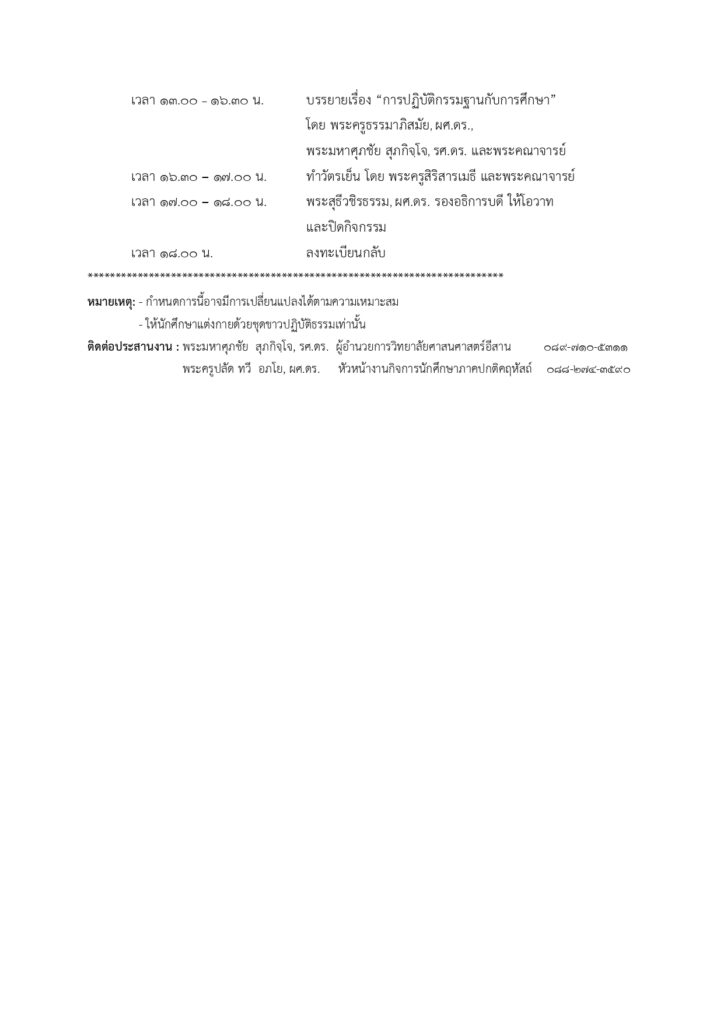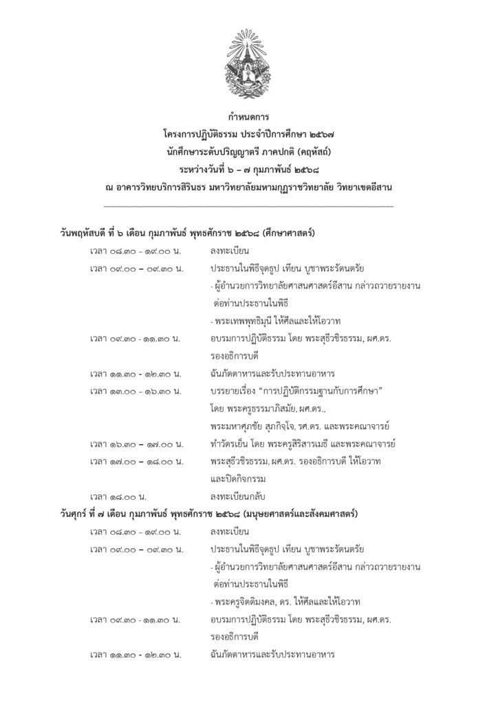 กำหนดการปฏิบัติธรรมประจำปี ภาคปกติ (คฤหัสถ์) วันที่ 6-7 กุมภาพันธ์ 2568  ณ ห้องประชุม อาคารศูนย์วิทยบริการสิรินธร มหาวิทยาลัยมหามกุฏราชวิทยาลัย วิทยาเขตอีสาน
