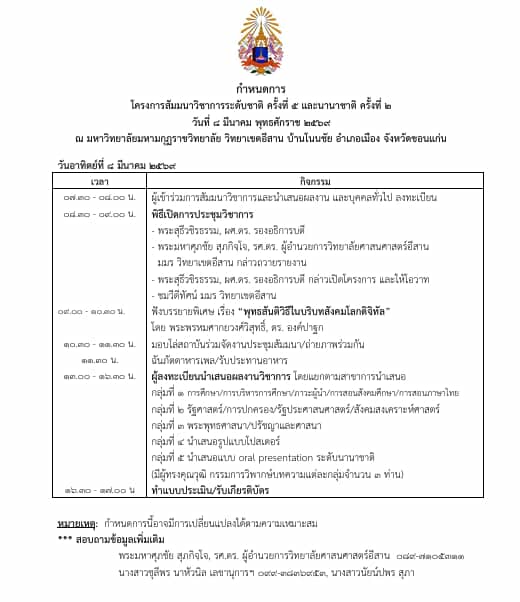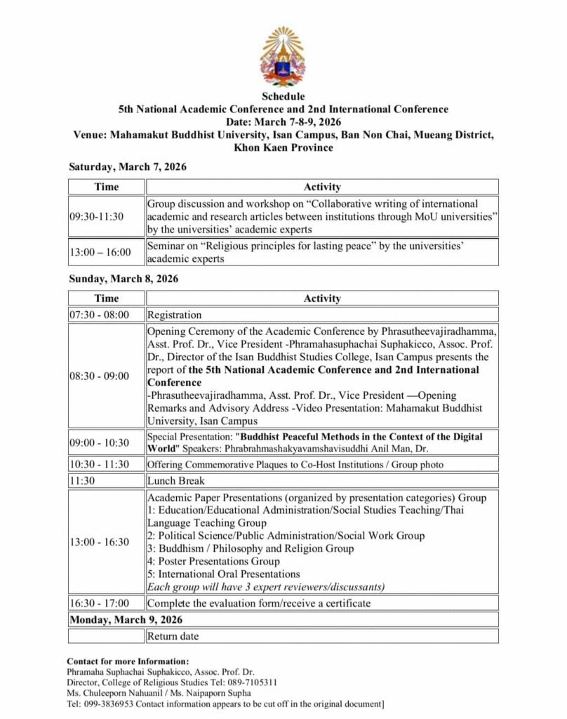 Schedule and Venue: Mahamakut Buddhist University, Isan Campus