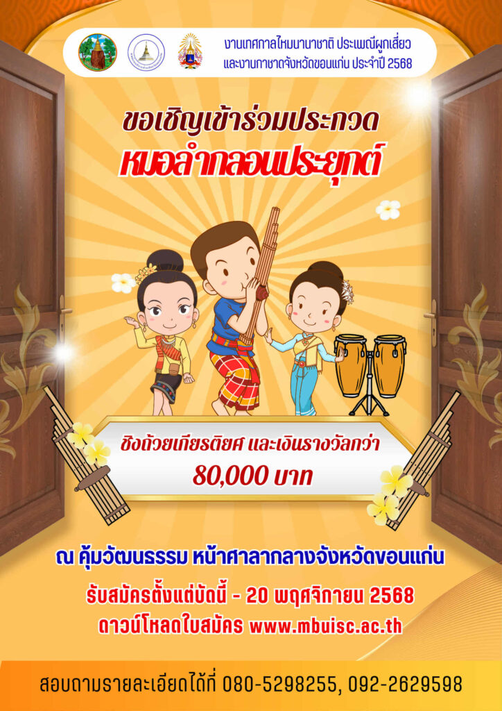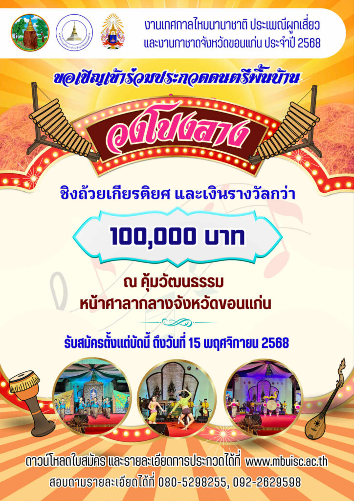 ขอเชิญร่วมประกวดโปงลางและหมอลำกลอนประยุกต์ ชิงรางวัลเกียรติยศ ณ คุ้มวัฒนธรรม ศาลากลางจังหวัดขอนแก่น เริ่มสมัครได้ตั้งแต่บัดนี้เป็นต้นไป ดาวน์โหลดเอกสาร รายละเอียดต่างๆ และใบสมัครได้ที่นี่