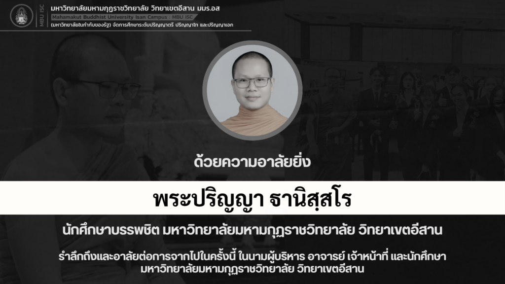 ด้วยความอาลัยยิ่ง พระปริญญา ฐานิสฺสโร นักศึกษาบรรพชิต มหาวิทยาลัยมหามกุฏราชวิทยาลัย วิทยาเขตอีสาน รำลึกถึงและอาลัย ในนามผู้บริหาร อาจารย์ เจ้าหน้าที่ และนักศึกษา มหาวิทยาลัยมหามกุฏราชวิทยาลัย วิทยาเขตอีสาน