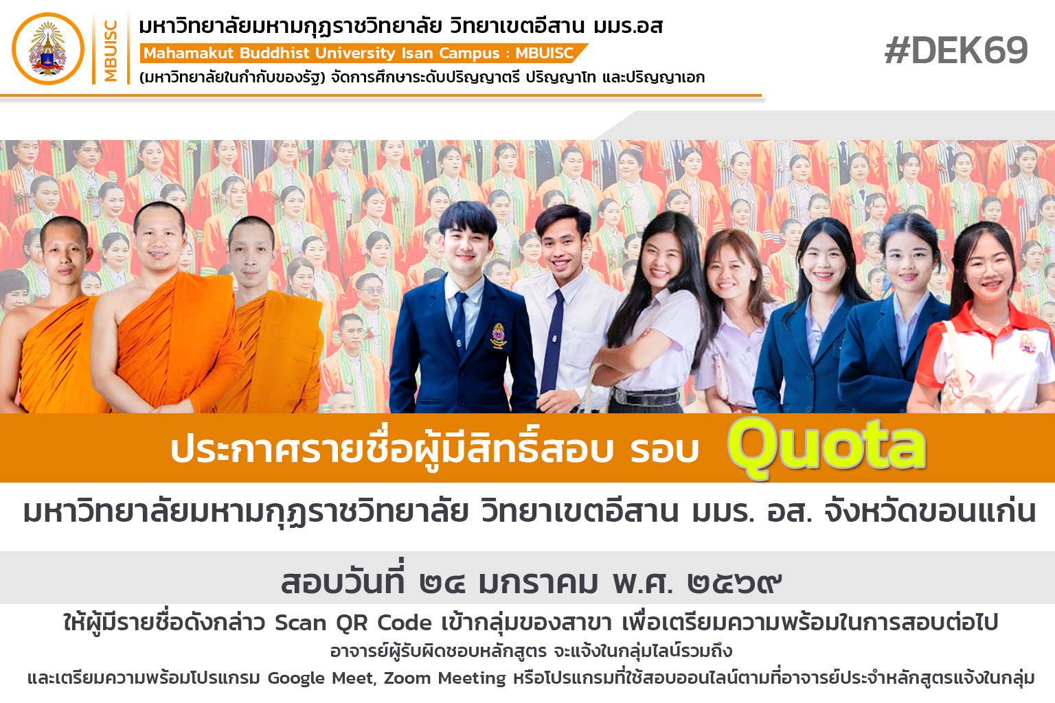 ประกาศรายชื่อผู้มีสิทธิ์สอบ รอบ Quota ประจำปีการศึกษา 2569 มหาวิทยาลัยมหามกุฏราชวิทยาลัย วิทยาเขตอีสาน ให้บุคคลผู้มีรายชื่อตามประกาศ scan เข้ากลุ่ม…