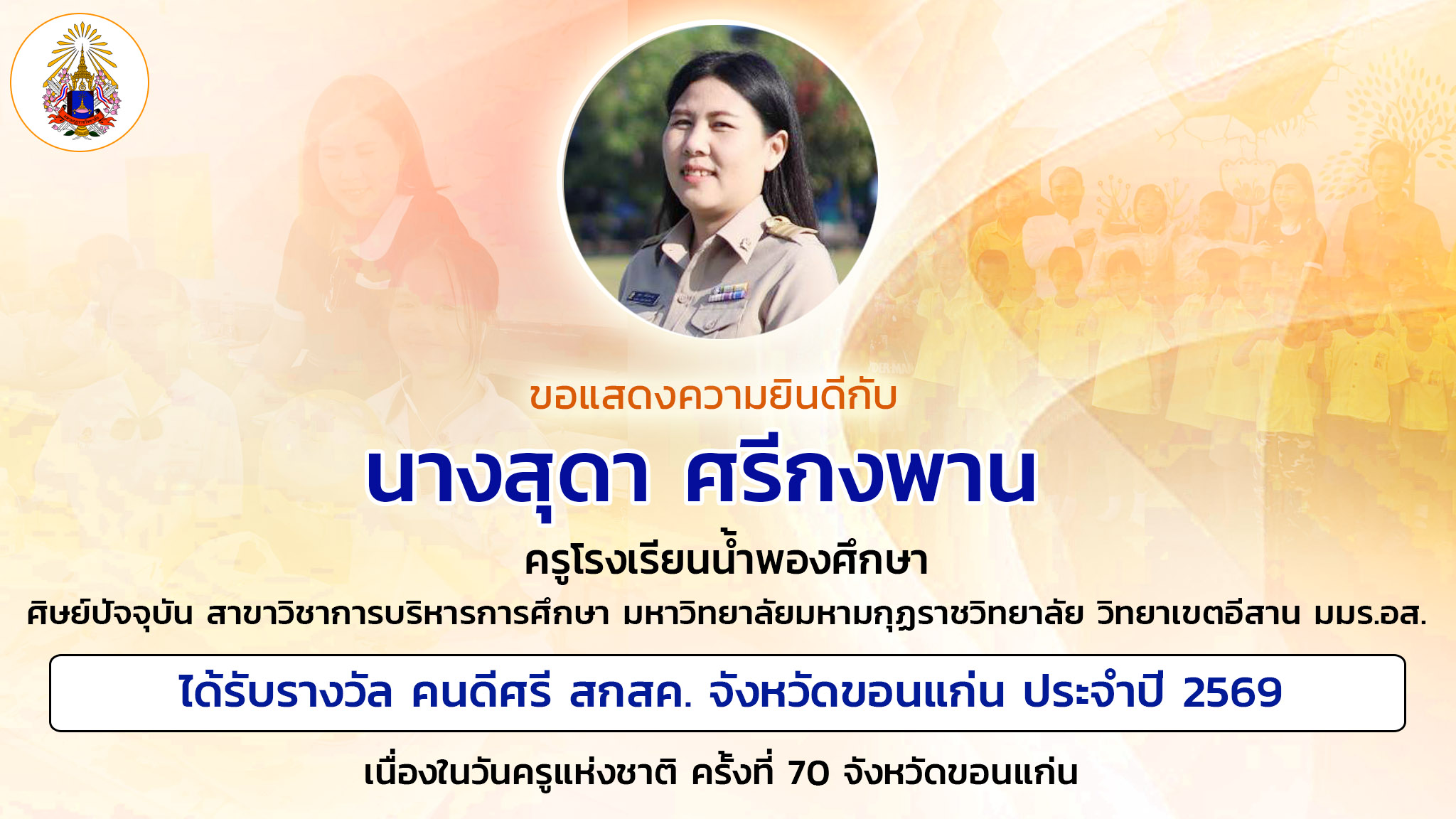 ขอแสดงความยินดีกับ นางสุดา ศรีกงพาน ครูโรงเรียนน้ำพองศึกษา ศิษย์ปัจจุบัน สาขาวิชาการบริหารการศึกษา มหาวิทยาลัยมหามกุฏราชวิทยาลัย วิทยาเขตอีสาน ได้รับรางวัล คนดีศรี…