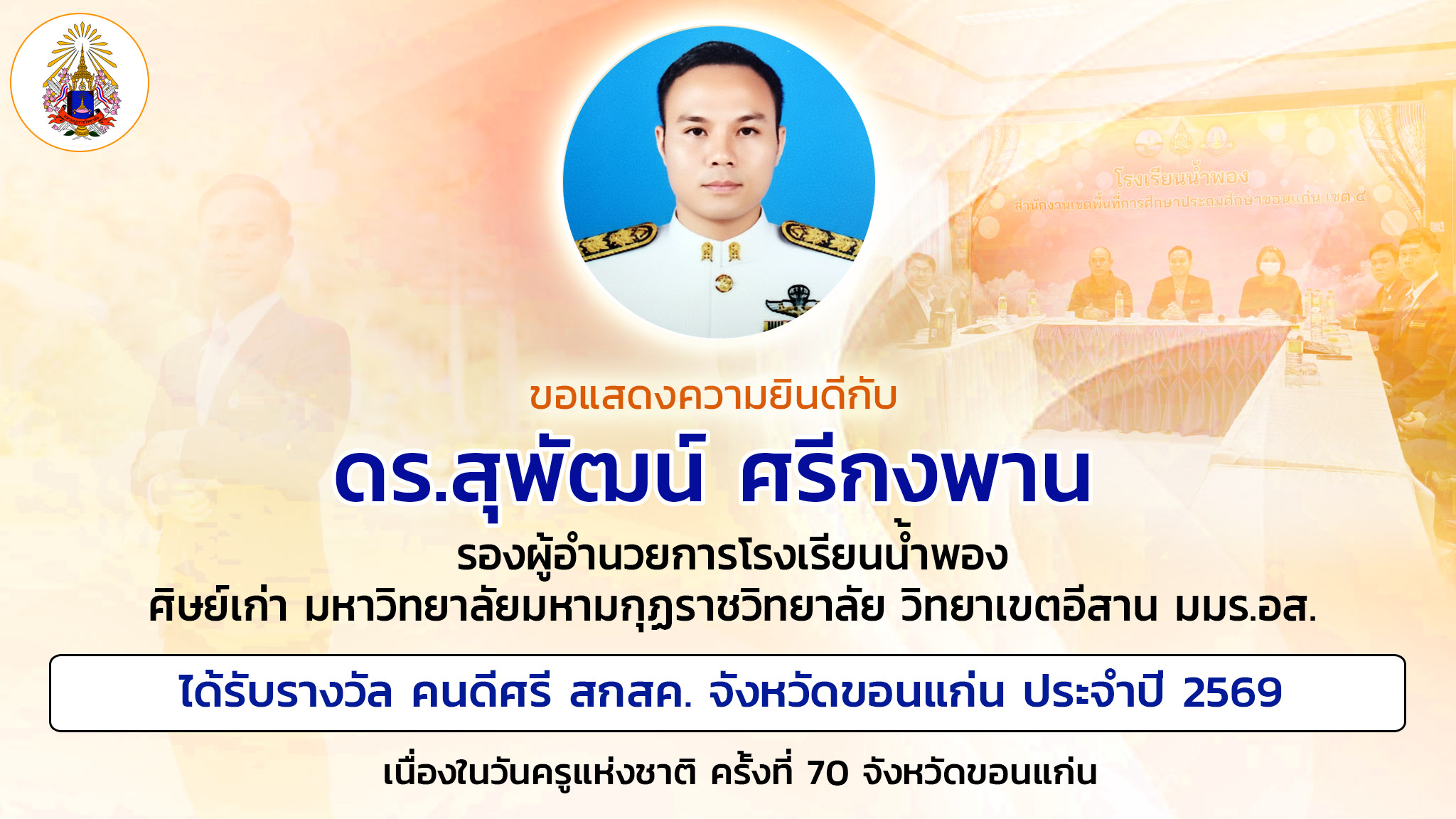 ขอแสดงความยินดีกับ ดร.สุพัฒน์ ศรีกงพาน รองผู้อำนวยการโรงเรียนน้ำพอง ศิษย์เก่า มหาวิทยาลัยมหามกุฏราชวิทยาลัย วิทยาเขตอีสาน ได้รับรางวัล คนดีศรี สกสค.จังหวัดขอนแก่น…