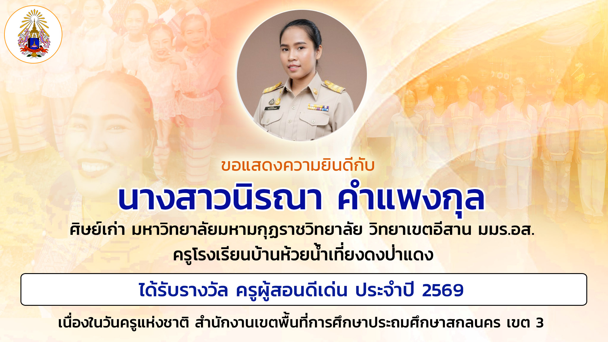 ขอแสดงความยินดีกับนางสาวนิรณา คำแพงกุล ศิษย์เก่า มหาวิทยาลัยมหามกุฏราชวิทยาลัย วิทยาเขตอีสาน ครูโรงเรียนบ้านห้วยน้ำเที่ยงดงป่าแดง ได้รับรางวัล ครูผู้สอนดีเด่น ประจำปี 2569…