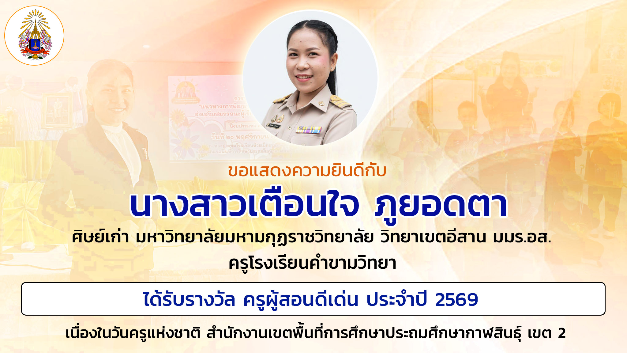ขอแสดงความยินดีกับ นางสาวเตือนใจ ภูยอดตา ศิษย์เก่า มหาวิทยาลัยมหามกุฏราชวิทยาลัย วิทยาเขตอีสาน ครูโรงเรียนคำขามวิทยา ได้รับรางวัล ครูผู้สอนดีเด่น ประจำปี…