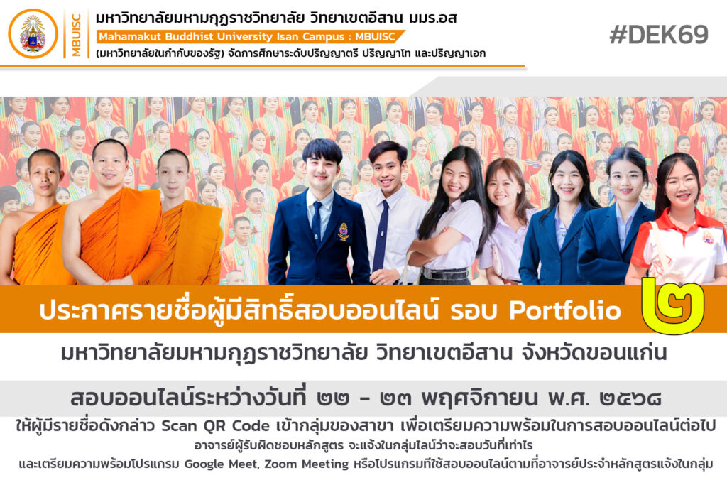 ประกาศรายชื่อผู้มีสิทธิ์สอบ รอบ Portfolio 2 ประจำปีการศึกษา 2569 มหาวิทยาลัยมหามกุฏราชวิทยาลัย วิทยาเขตอีสาน ให้บุคคลผู้มีรายชื่อตามประกาศ scan เข้ากลุ่ม QR code ไลน์ ของสาขาวิชาตนเอง ใต้ประกาศรายชื่อแตละสาขา เพื่อรับฟังการชี้แจงกระบวนการสัมภาษณ์จากอาจารย์ประจำสาขา