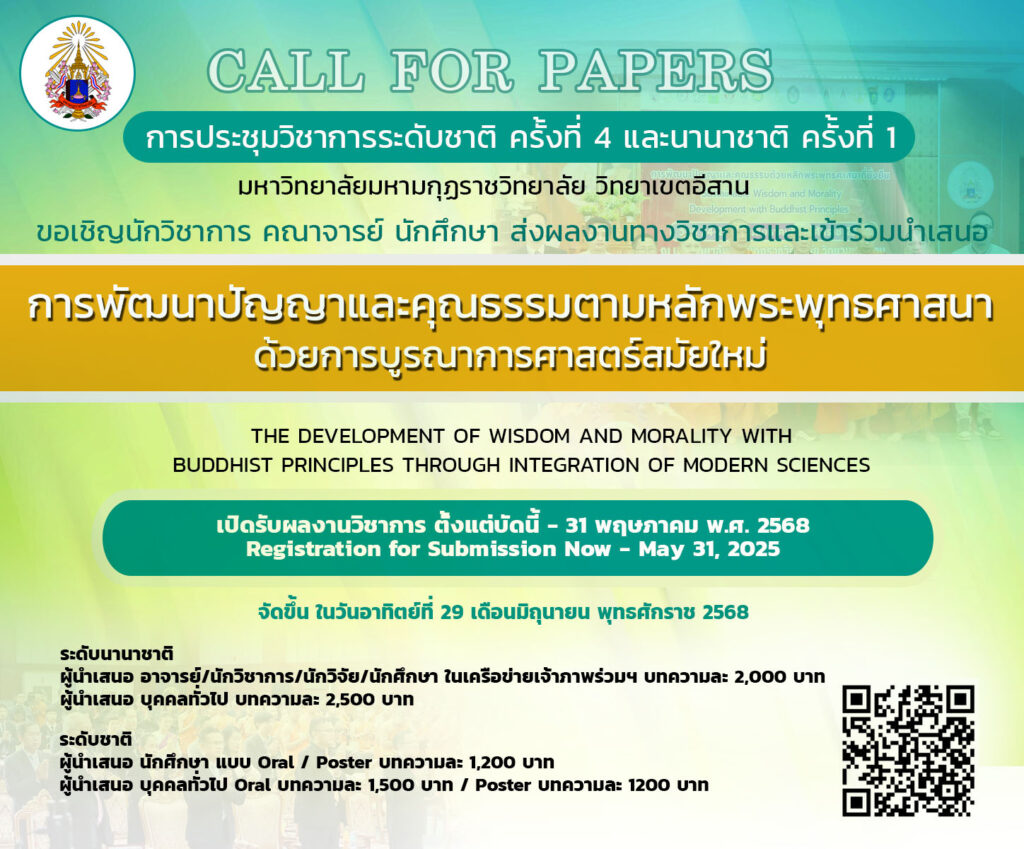 ด้วยเหตุนี้ มหาวิทยาลัยมหามกุฏราชวิทยาลัย วิทยาเขตอีสาน จึงได้จัดการประชุมสัมมนาวิชาการระดับชาติและนานาชาติ ภายใต้หัวข้อ “ด้วยการบูรณาการศาสตร์สมัยใหม่” เพื่อเป็นเวทีวิชาการให้นักวิจัย นักศึกษา และผู้สนใจได้นำเสนอผลงานวิจัยและแลกเปลี่ยนองค์ความรู้ทั้งด้านการศึกษา การบริหารการศึกษา ภาวะผู้นำ พุทธศาสนาและปรัชญา รัฐศาสตร์ การปกครอง รัฐประศาสนศาสตร์ สังคมสงเคราะห์ศาสตร์ การสอนภาษาไทย และการสอนสังคมศึกษา เพื่อบูรณาการศาสตร์ต่างๆ เข้ากับหลักพระพุทธศาสนา อันจะนำไปสู่การพัฒนาคุณภาพงานวิจัยและการสร้างสรรค์นวัตกรรมที่เป็นประโยชน์ต่อการพัฒนาสังคมอย่างยั่งยืนต่อไป
