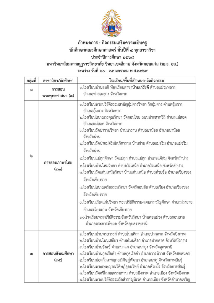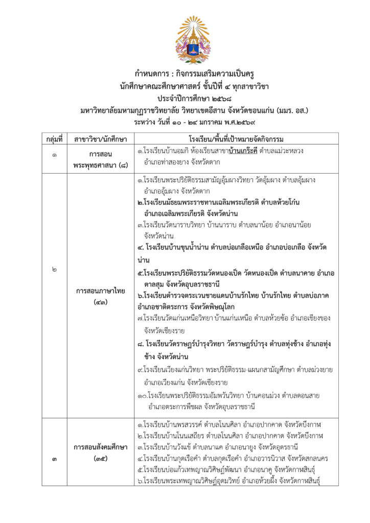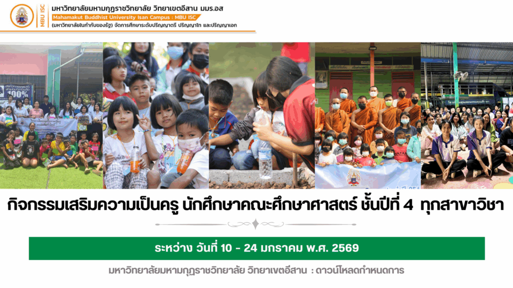 กำหนดการ : กิจกรรมเสริมความเป็นครู นักศึกษาคณะศึกษาศาสตร์ ชั้นปีที่ 4 ทุกสาขาวิชา ประจำปีการศึกษา 2568 มหาวิทยาลัยมหามกุฏราชวิทยาลัย วิทยาเขตอีสาน จังหวัดขอนแก่น (มมร. อส.) ระหว่าง วันที่ 10 – 24 มกราคม พ.ศ.2569